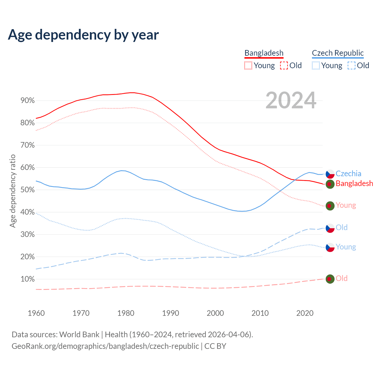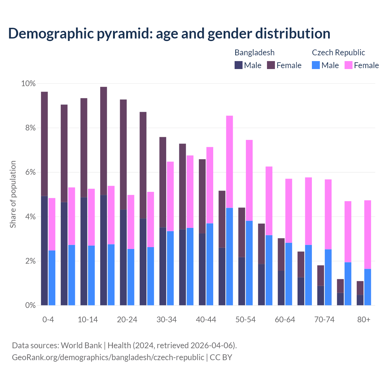 - Bangladesh is ranked 124/196 by median age (oldest to youngest) vs 21/196 for the Czech Republic.