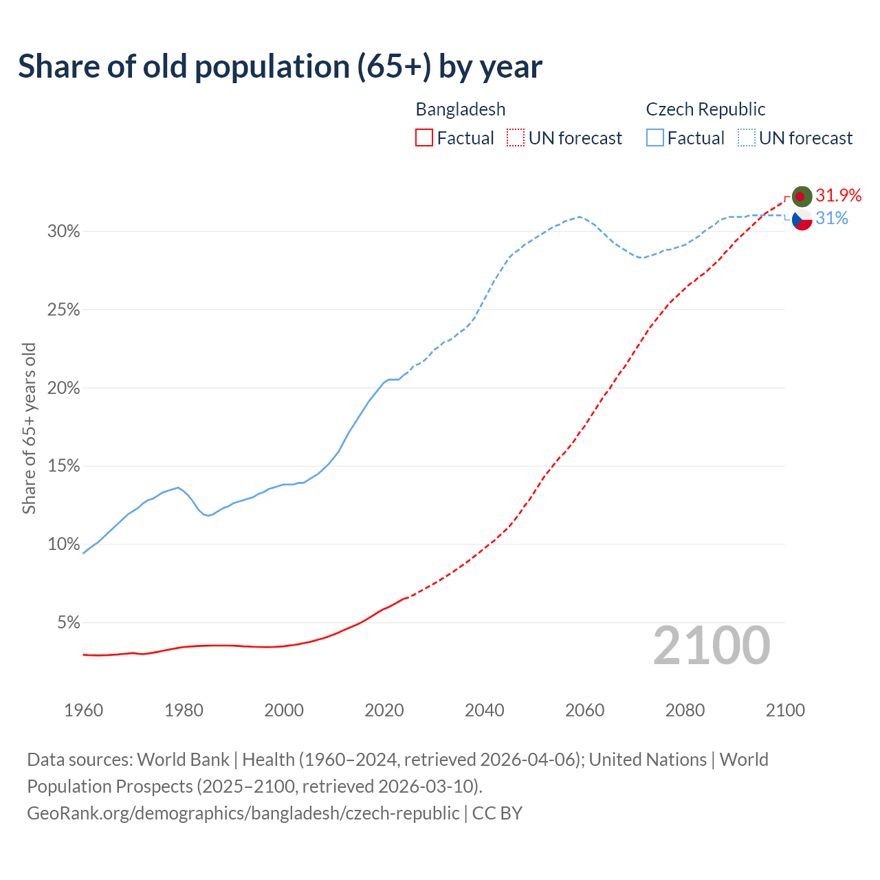 The share of older people aged 65 and over is 6.5% in Bangladesh and 20.8% in the Czech Republic. Life expectancy in Bangladesh compared to the Czech Republic .