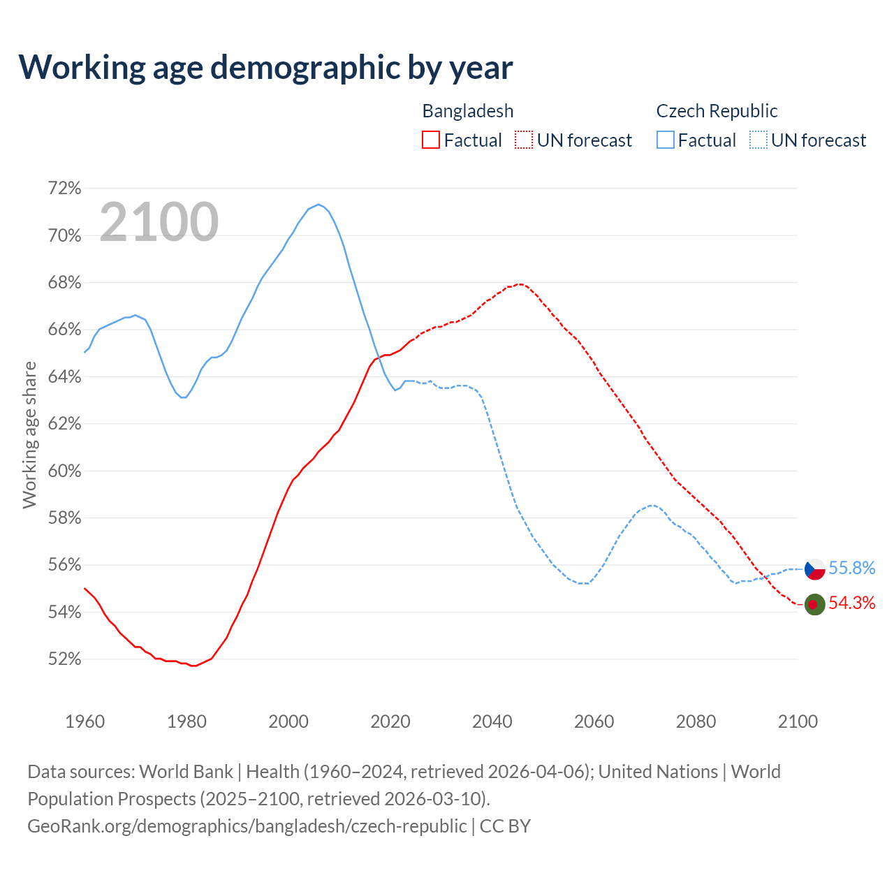 - Bangladesh has 117M working age adults (aged 15-64) vs 6.79M in the Czech Republic.