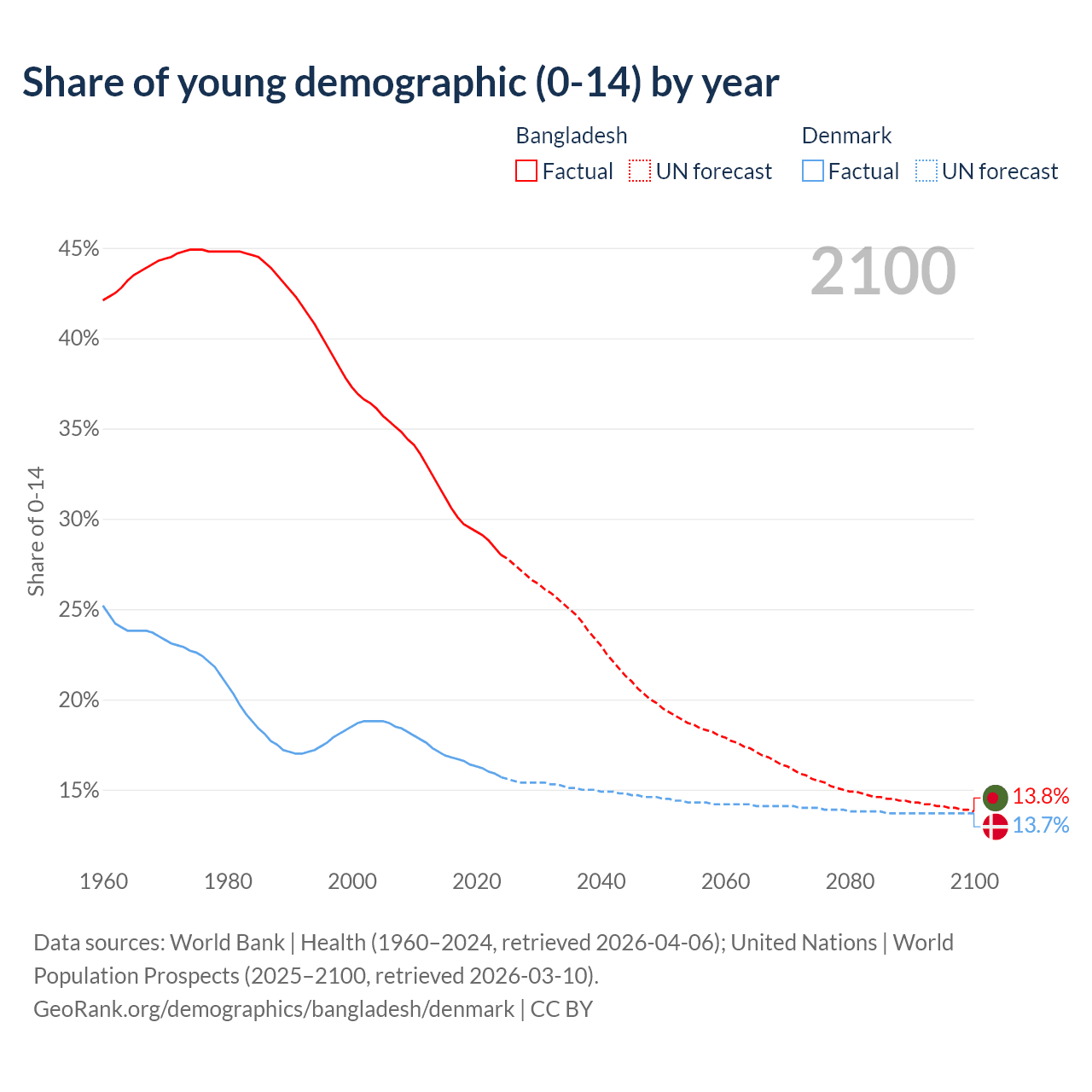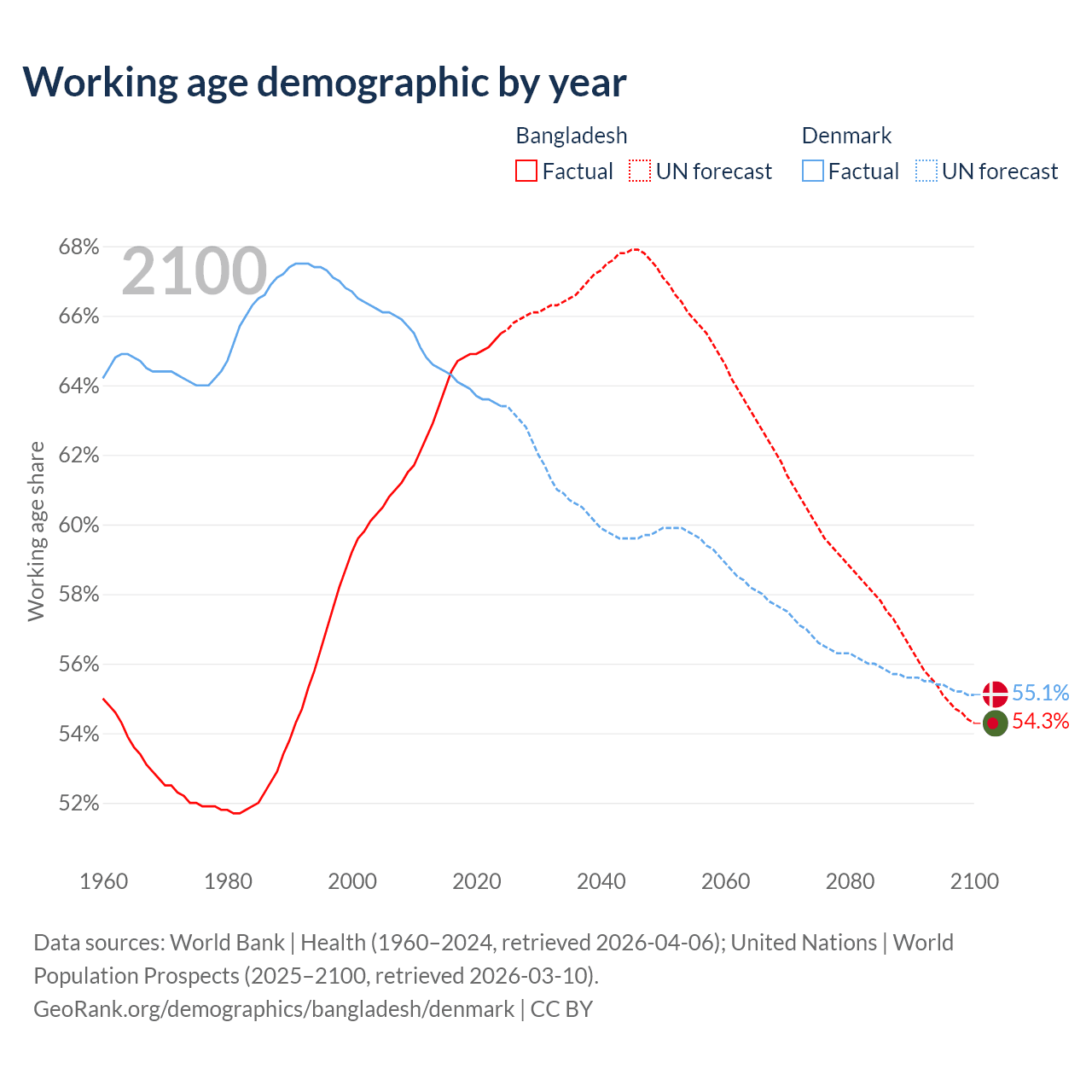 Median age Bangladesh vs Denmark, 1960-2100