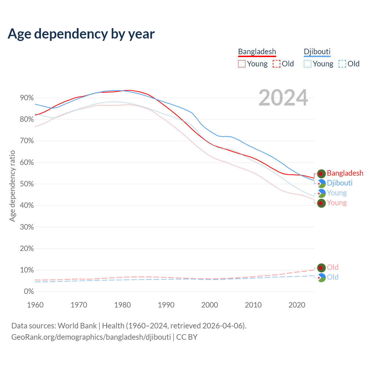 - Bangladesh is ranked 124/196 by median age (oldest to youngest) vs 129/196 for Djibouti.