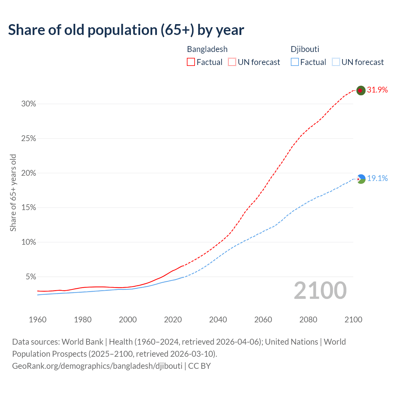 The share of older people aged 65 and over is 6.5% in Bangladesh and 4.85% in Djibouti. Life expectancy in Bangladesh compared to Djibouti .