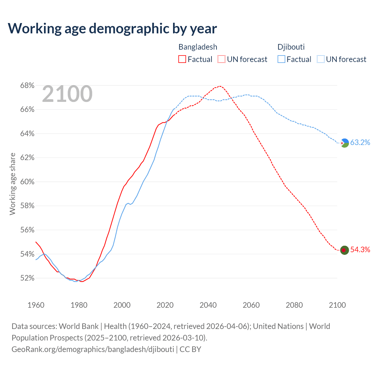 Median age Bangladesh vs Djibouti, 1960-2100