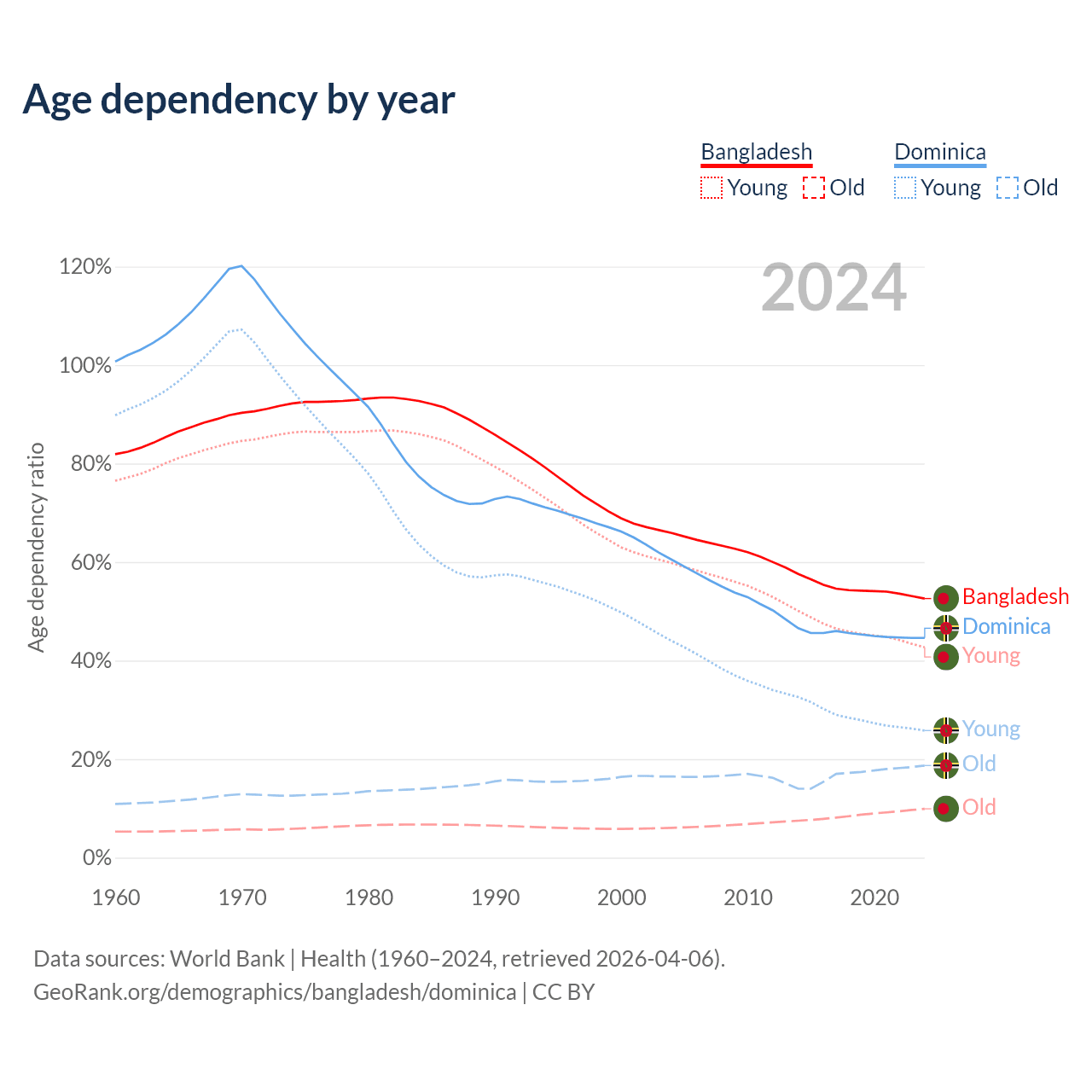 - Bangladesh is ranked 124/196 by median age (oldest to youngest) vs 66/196 for Dominica.