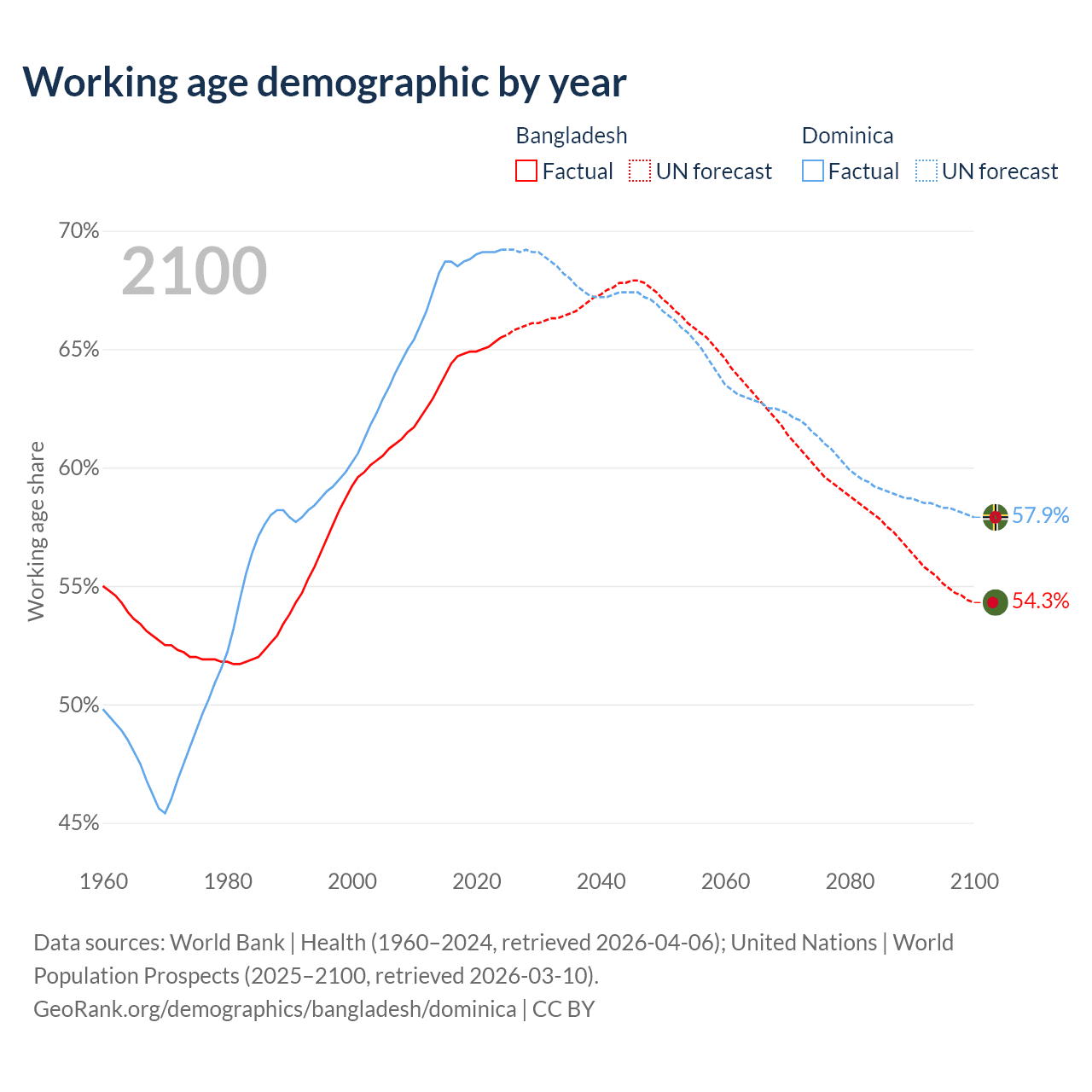 - Bangladesh has 117M working age adults (aged 15-64) vs 45.3K in Dominica.