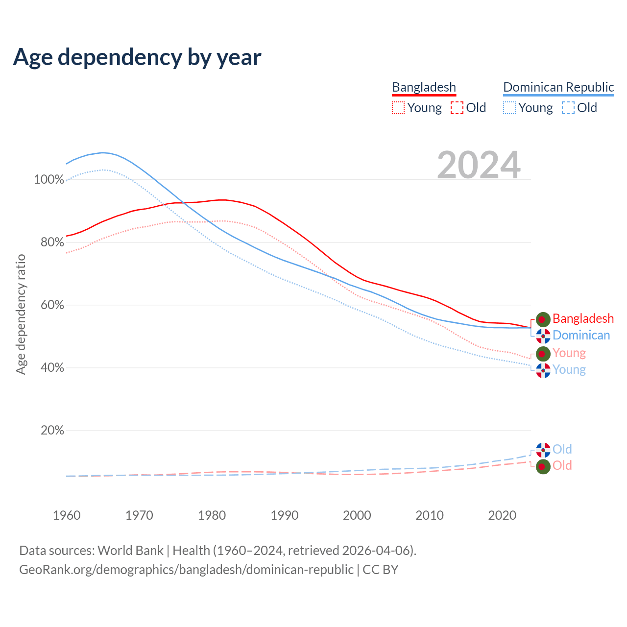 - Bangladesh is ranked 124/196 by median age (oldest to youngest) vs 112/196 for the Dominican Republic.