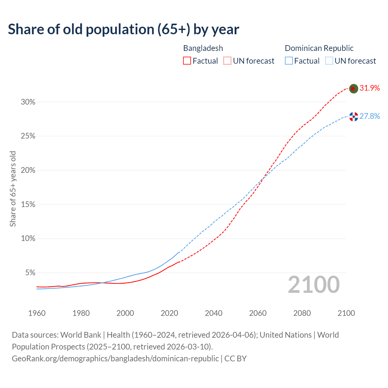 The share of older people aged 65 and over is 6.5% in Bangladesh and 7.88% in the Dominican Republic. Life expectancy in Bangladesh compared to the Dominican Republic .