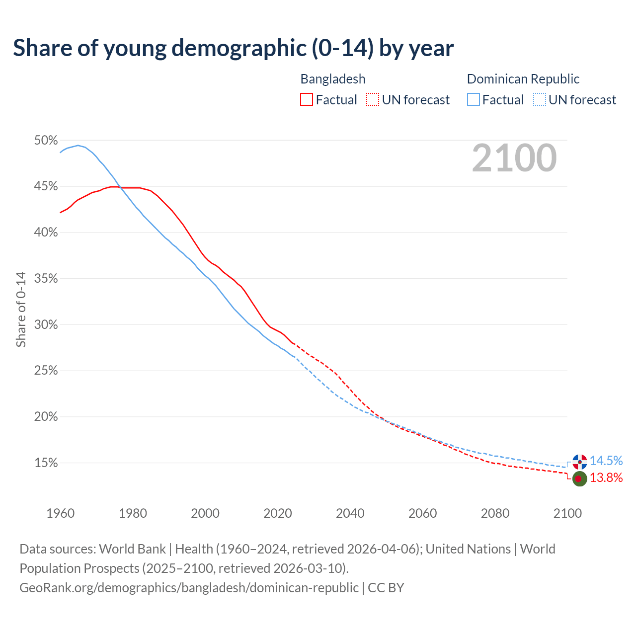 - The share of young demographic (0-15 years old) in Bangladesh is 28% vs 26.6% in the Dominican Republic.