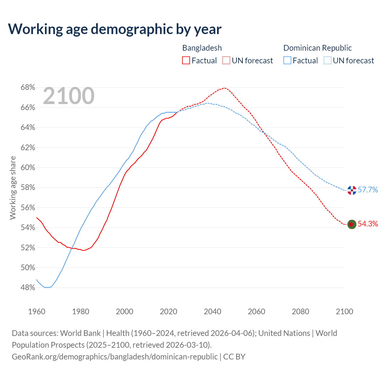 Median age Bangladesh vs Dominican Republic, 1960-2100
