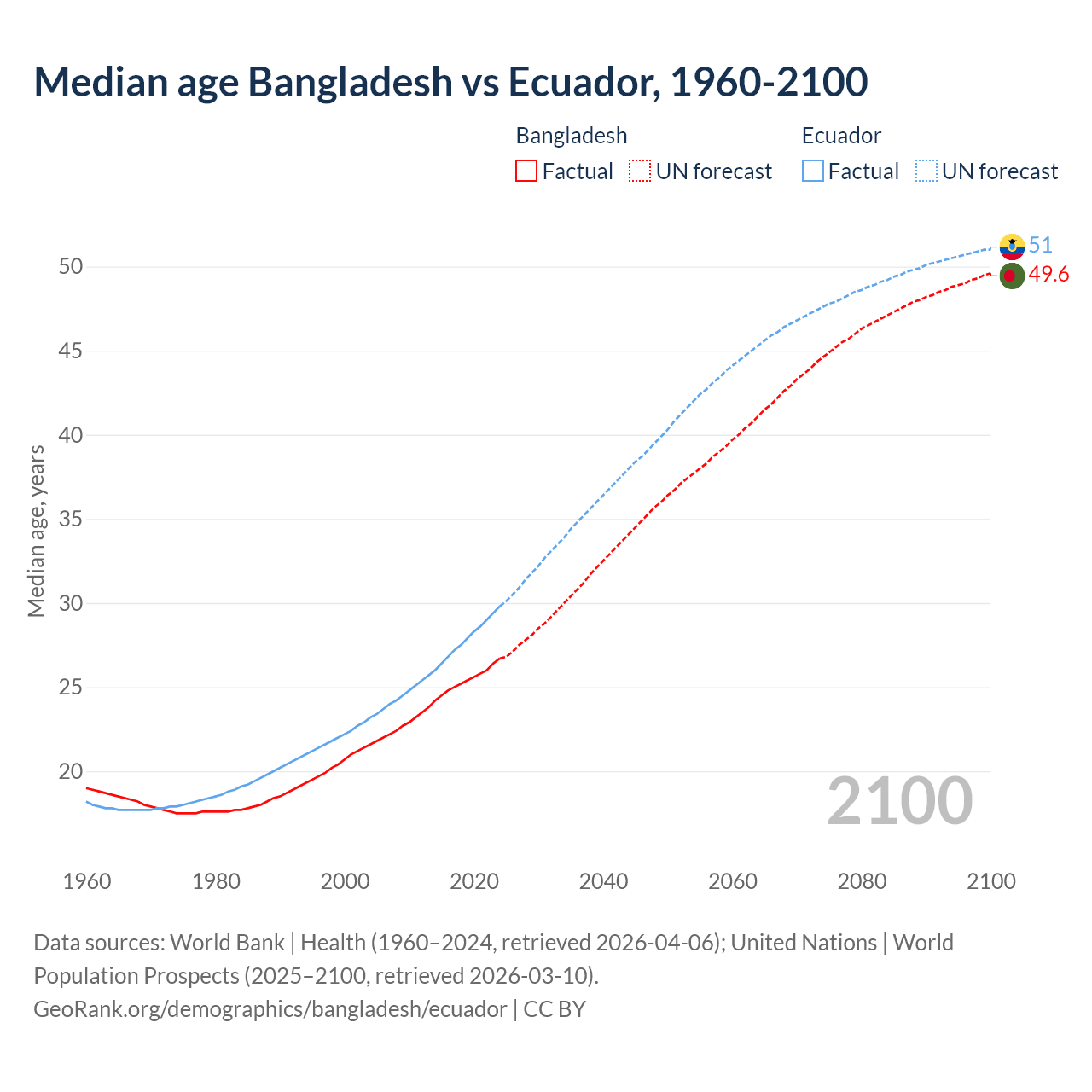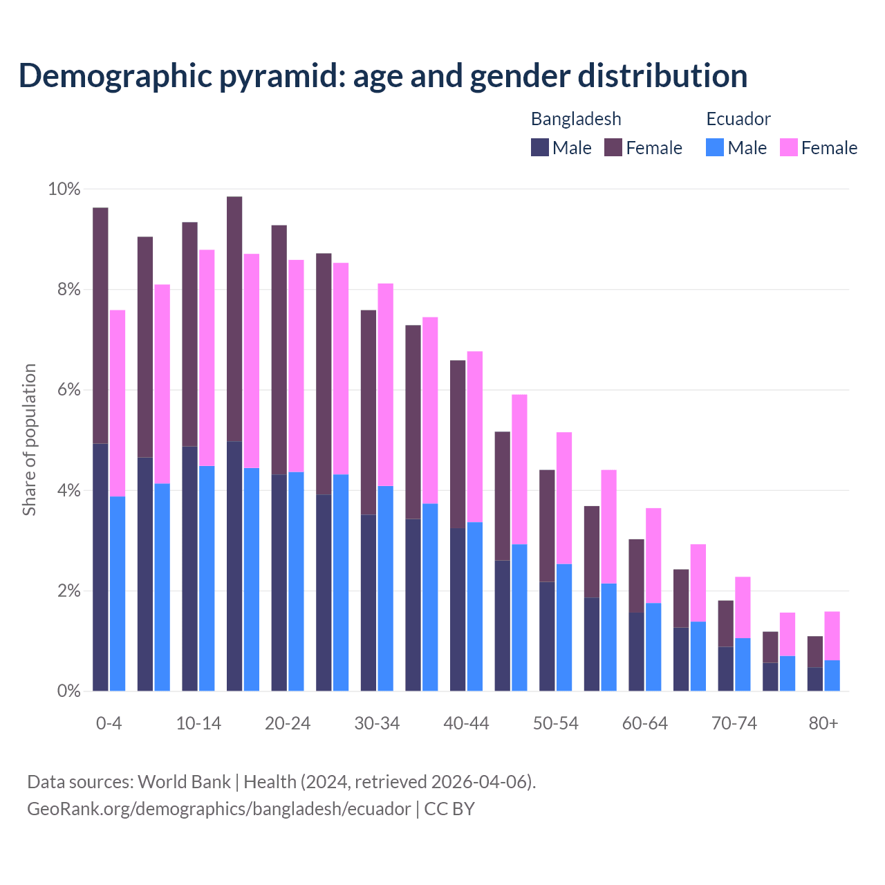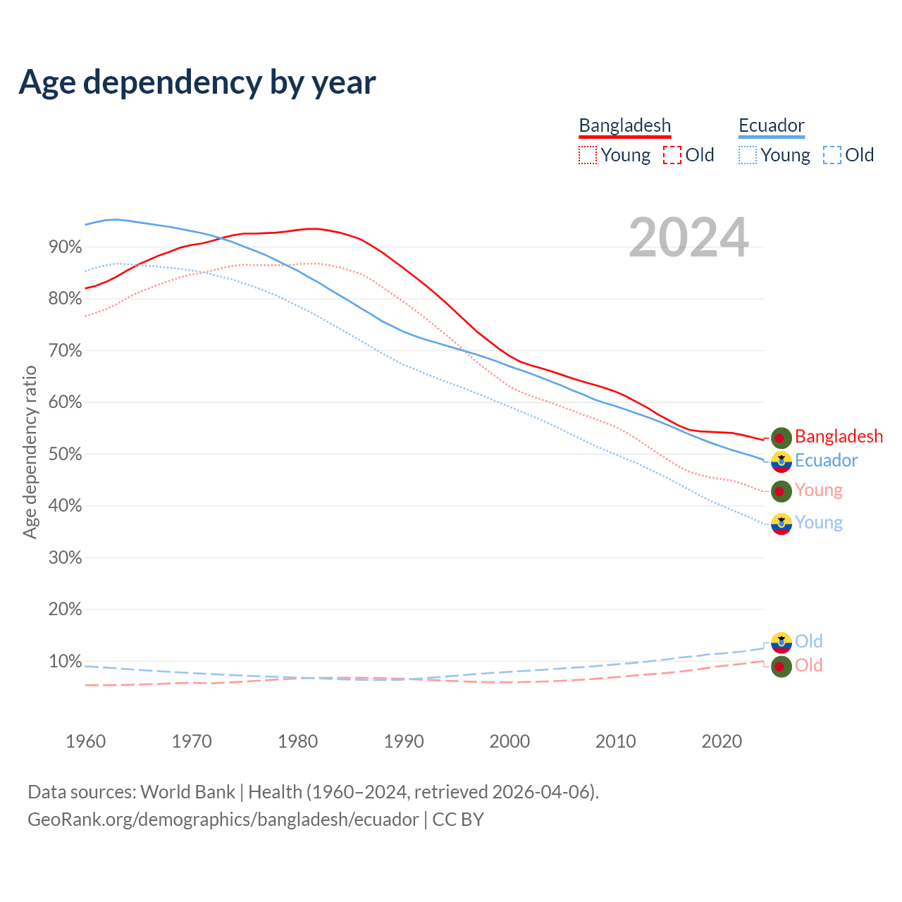 - Bangladesh is ranked 124/196 by median age (oldest to youngest) vs 105/196 for Ecuador.