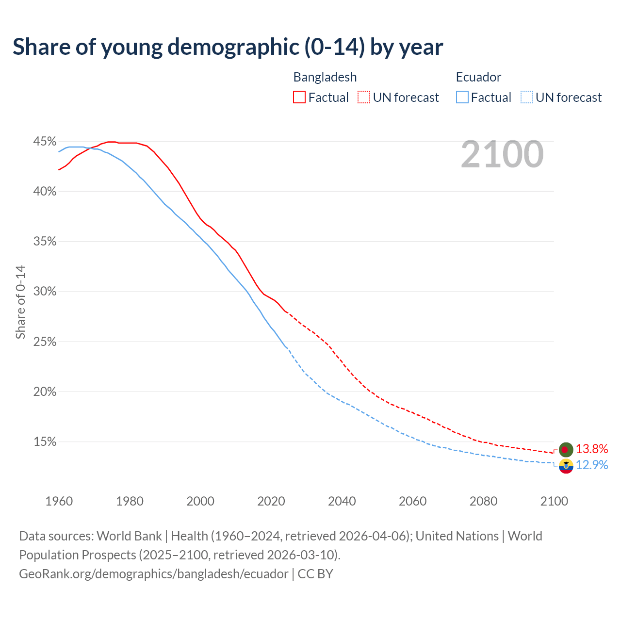 - The share of young demographic (0-15 years old) in Bangladesh is 28% vs 24.5% in Ecuador.