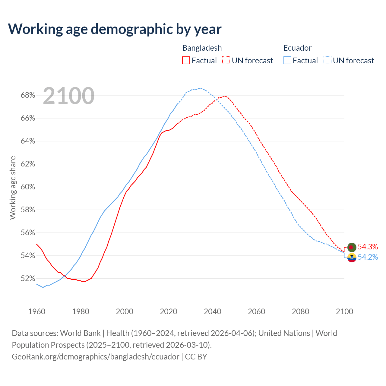 - Bangladesh has 117M working age adults (aged 15-64) vs 12.4M in Ecuador.
