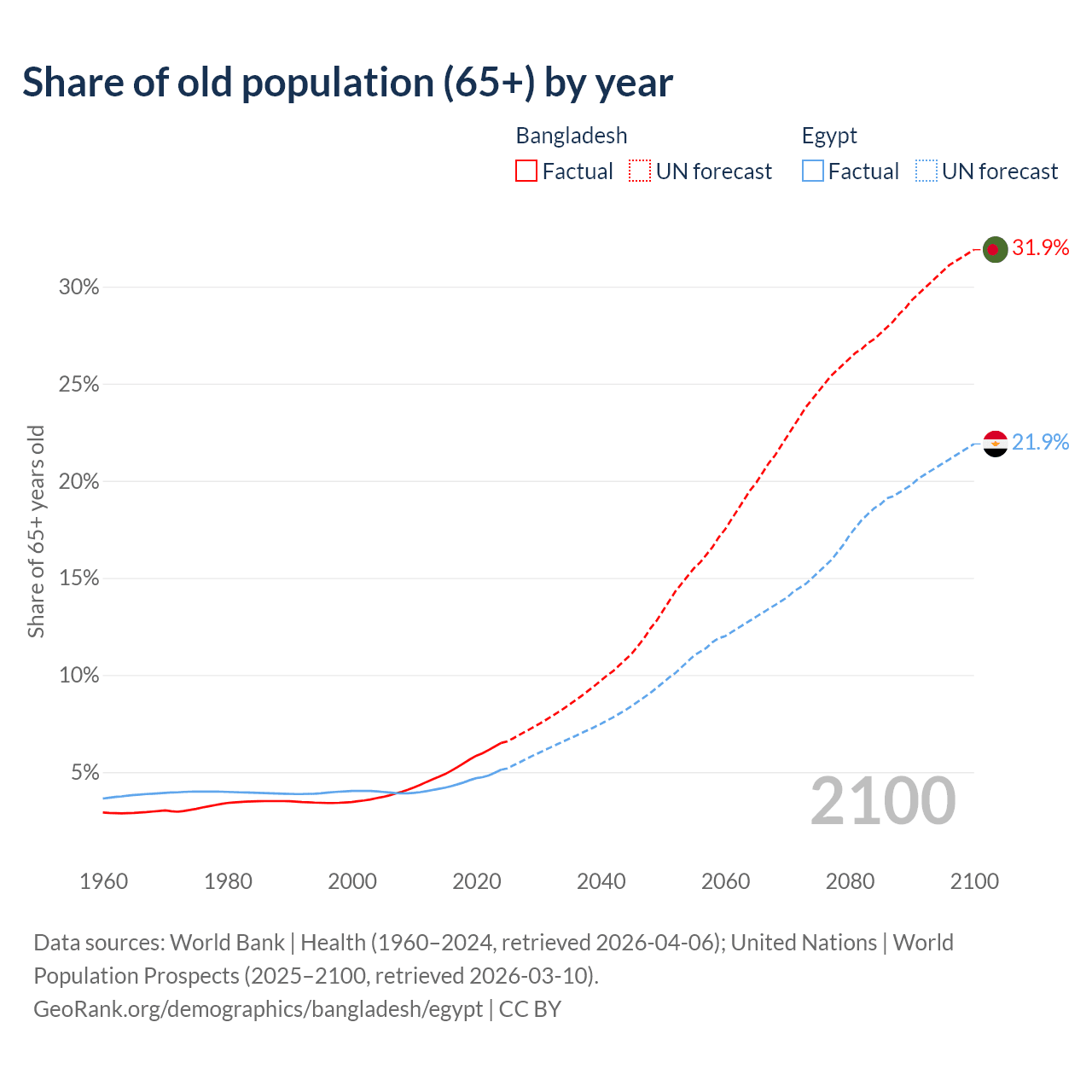 The share of older people aged 65 and over is 6.5% in Bangladesh and 5.12% in Egypt. Life expectancy in Bangladesh compared to Egypt .