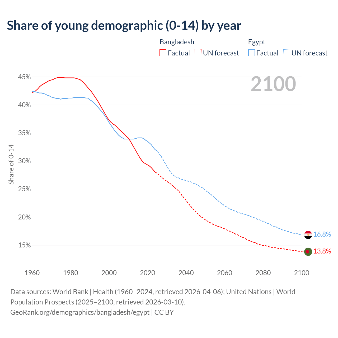 - The share of young demographic (0-15 years old) in Bangladesh is 28% vs 32% in Egypt.