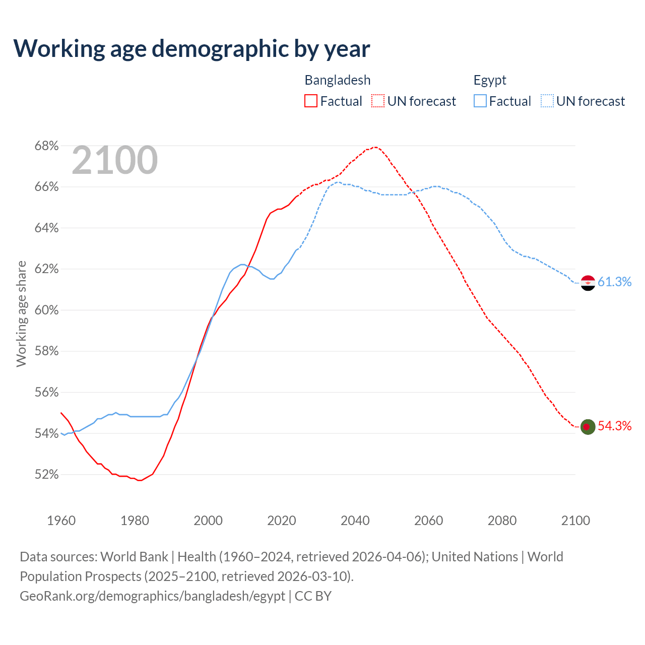 Median age Bangladesh vs Egypt, 1960-2100