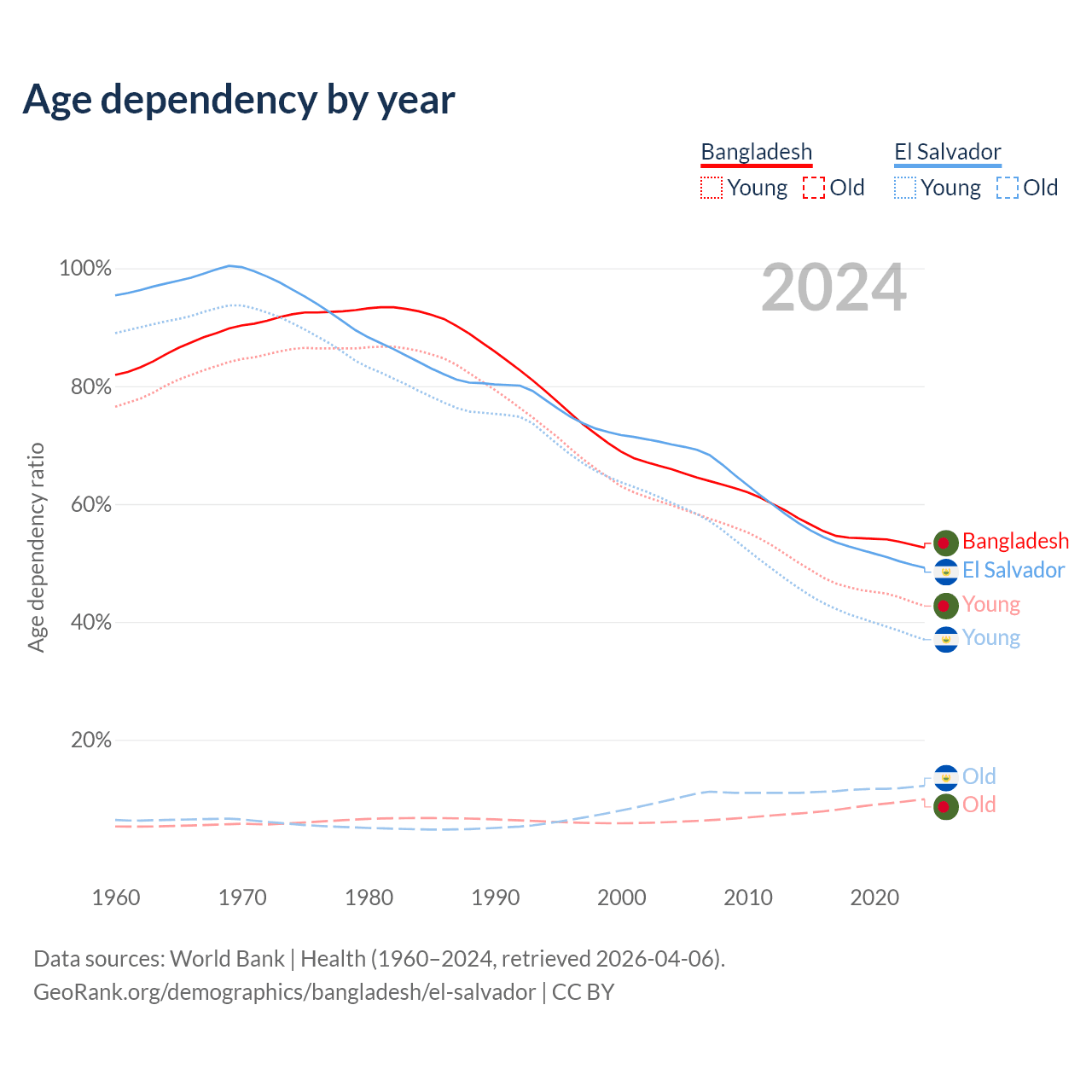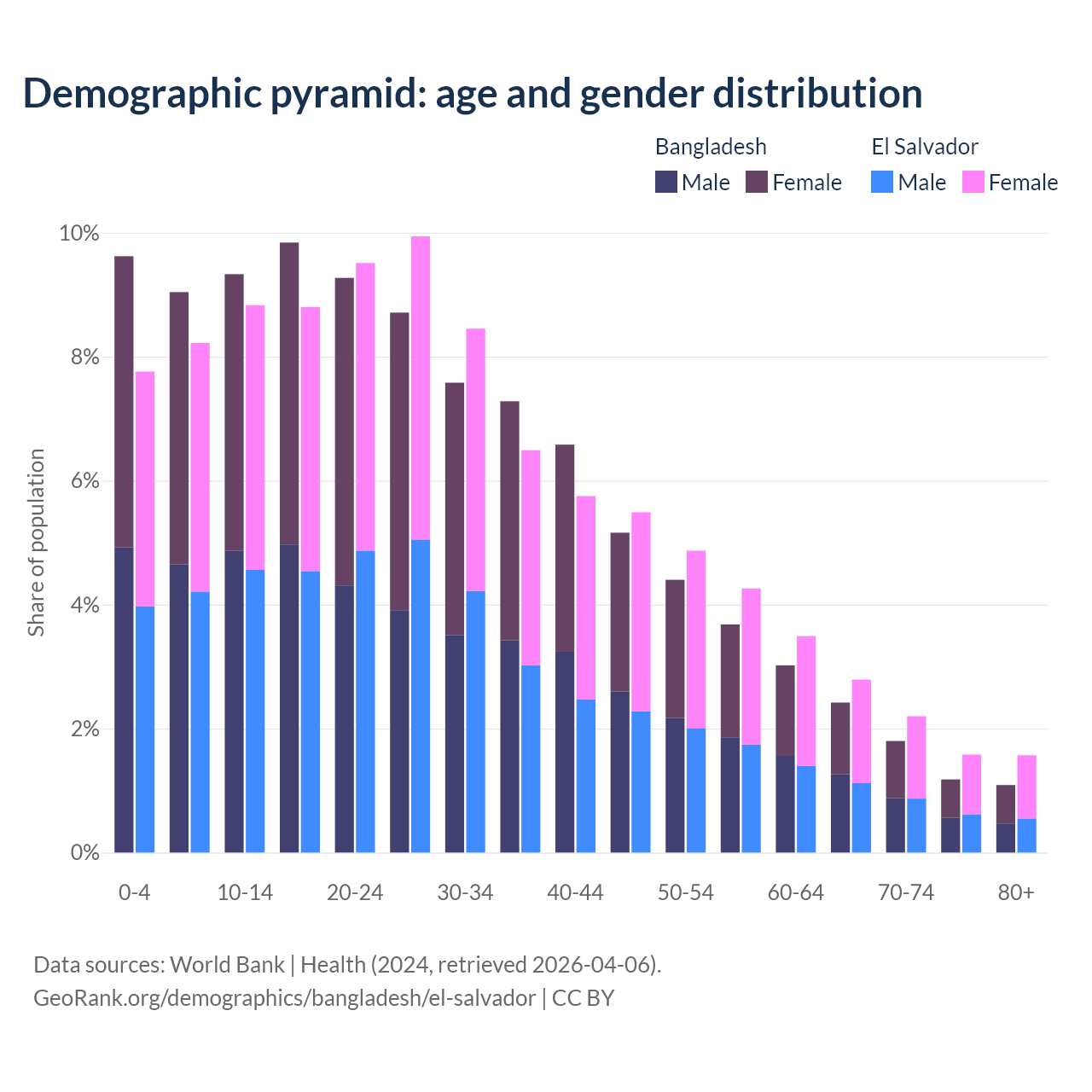 - Bangladesh is ranked 124/196 by median age (oldest to youngest) vs 115/196 for El Salvador.