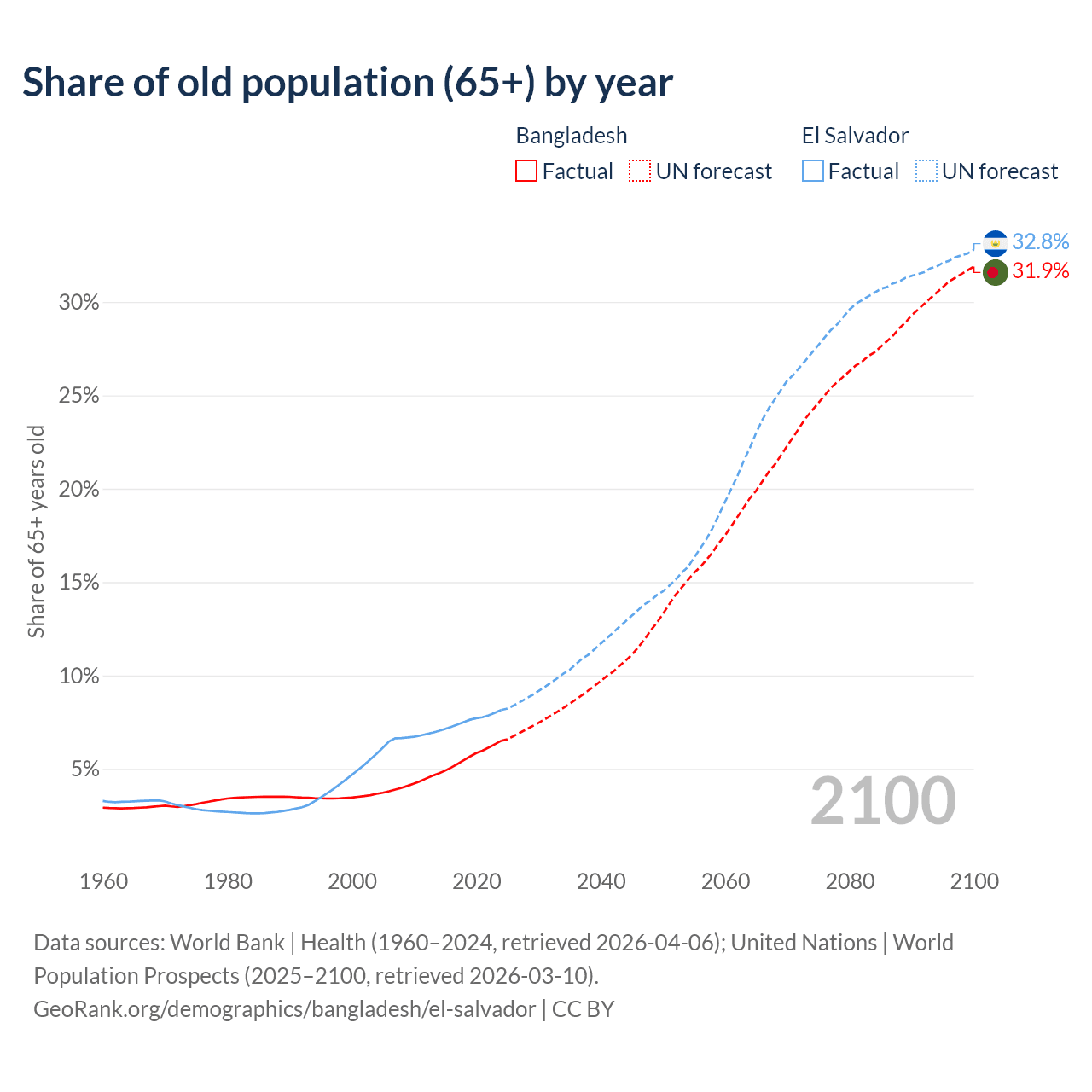 The share of older people aged 65 and over is 6.5% in Bangladesh and 8.15% in El Salvador. Life expectancy in Bangladesh compared to El Salvador .