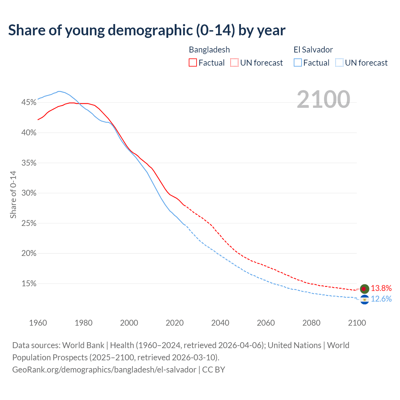 - The share of young demographic (0-15 years old) in Bangladesh is 28% vs 24.8% in El Salvador.
