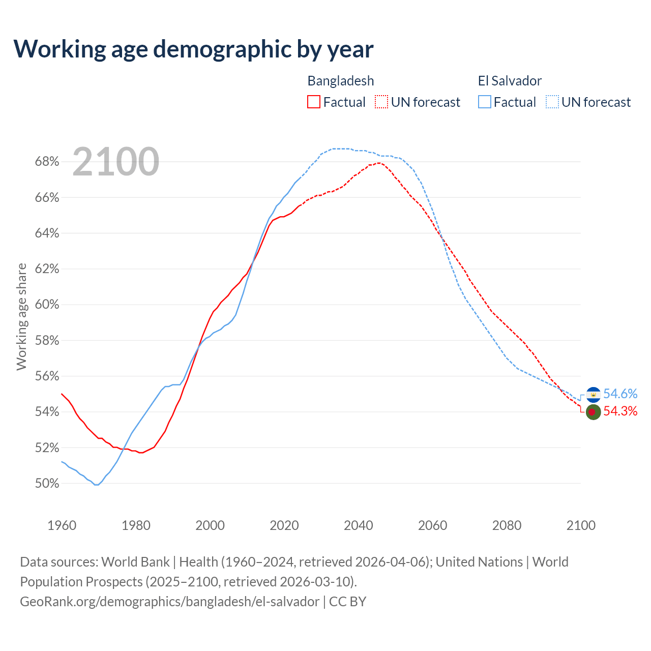 - Bangladesh has 117M working age adults (aged 15-64) vs 4.29M in El Salvador.