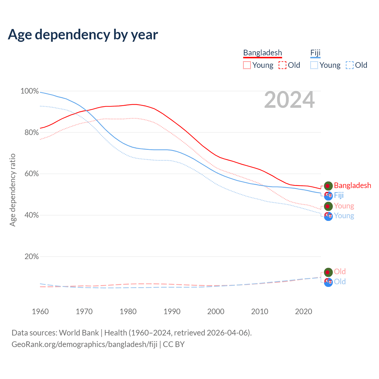 - The share of old-age demographic (65+) in Bangladesh is 6.5% vs 6.49% in Fiji.