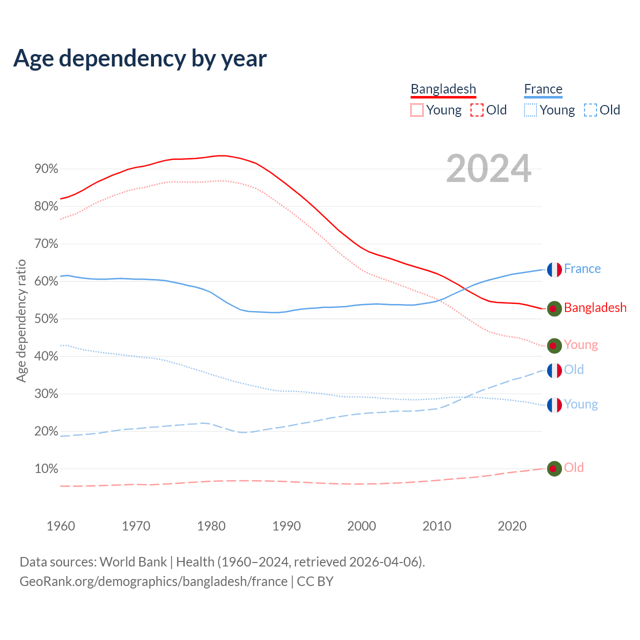 - Bangladesh is ranked 124/196 by median age (oldest to youngest) vs 29/196 for France.
