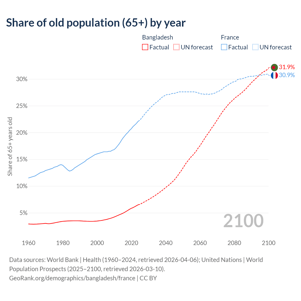 The share of older people aged 65 and over is 6.5% in Bangladesh and 22.1% in France. Life expectancy in Bangladesh compared to France .