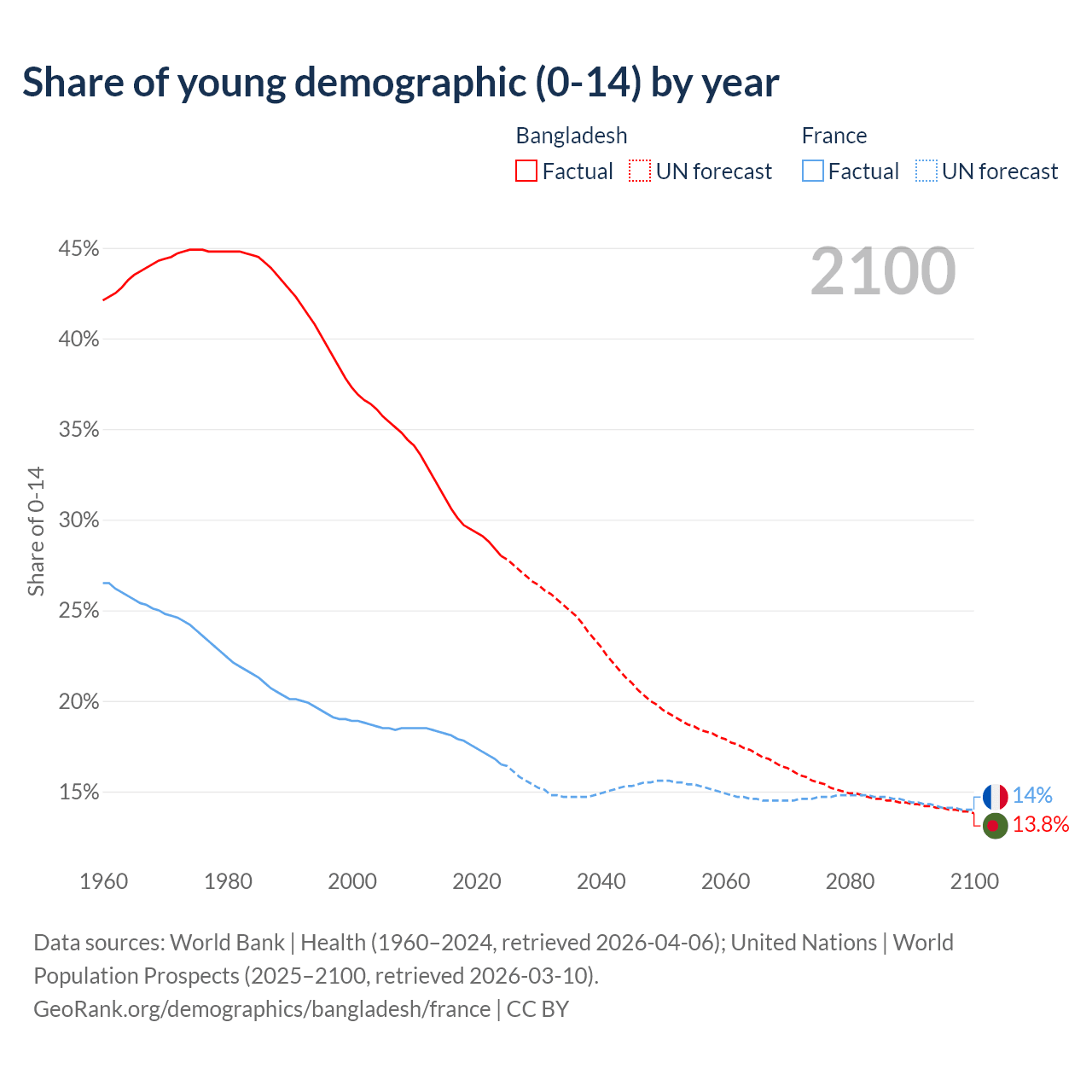 - The share of young demographic (0-15 years old) in Bangladesh is 28% vs 16.5% in France.