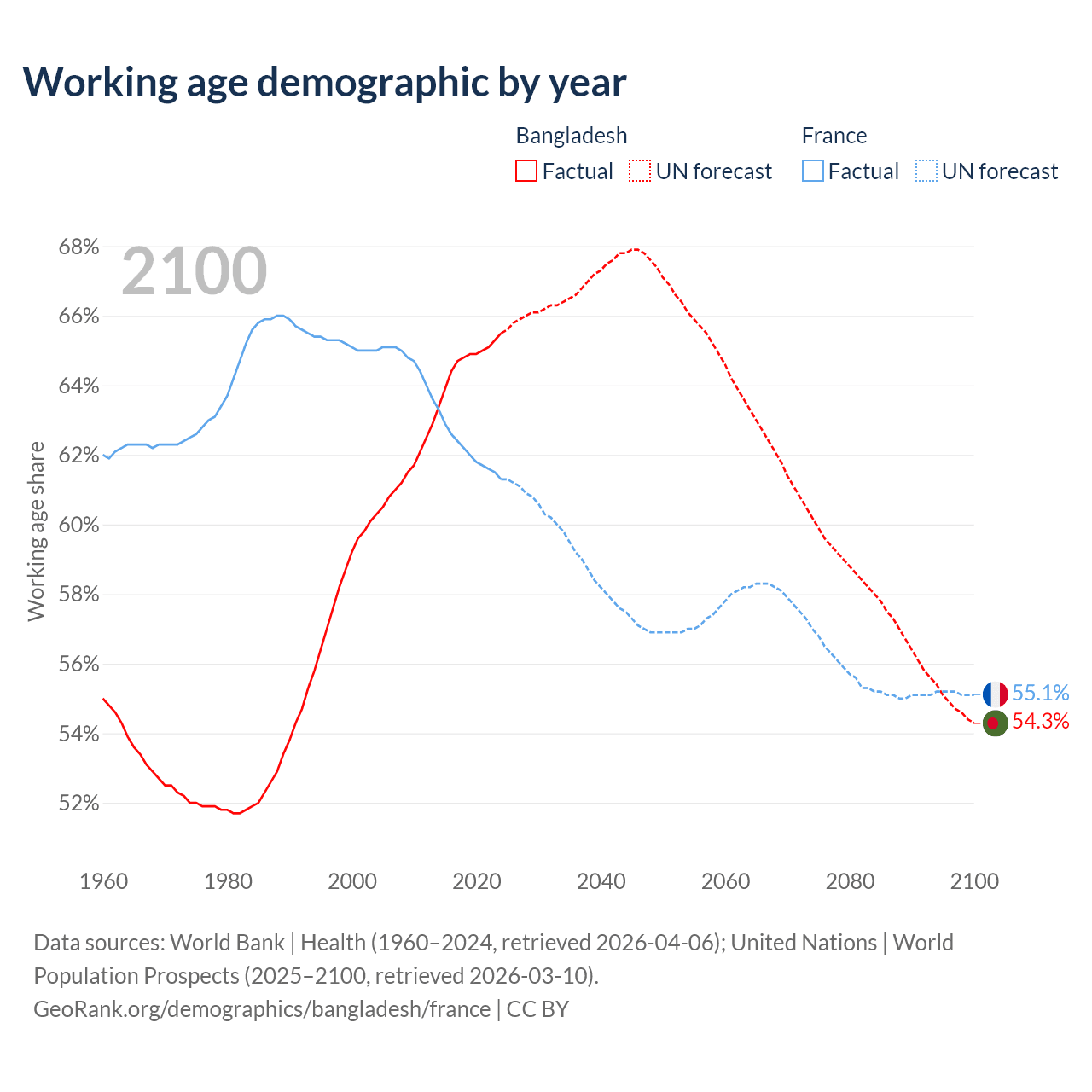 - Bangladesh has 117M working age adults (aged 15-64) vs 42.2M in France.