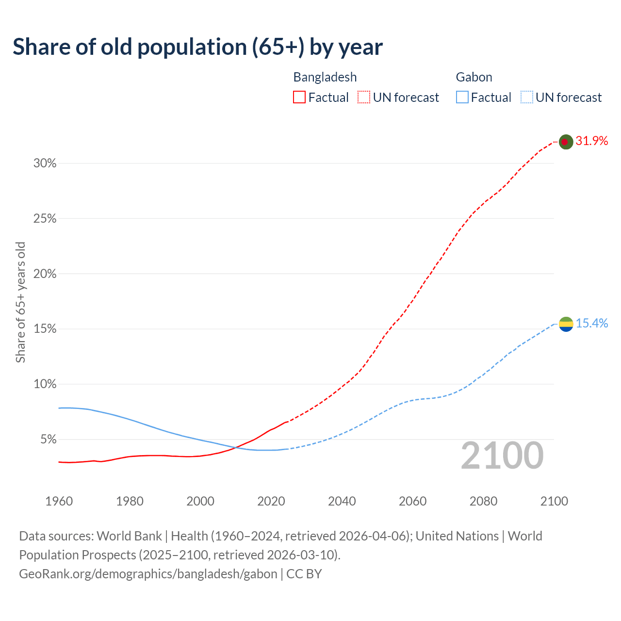 The share of older people aged 65 and over is 6.5% in Bangladesh and 4.08% in Gabon. Life expectancy in Bangladesh compared to Gabon .