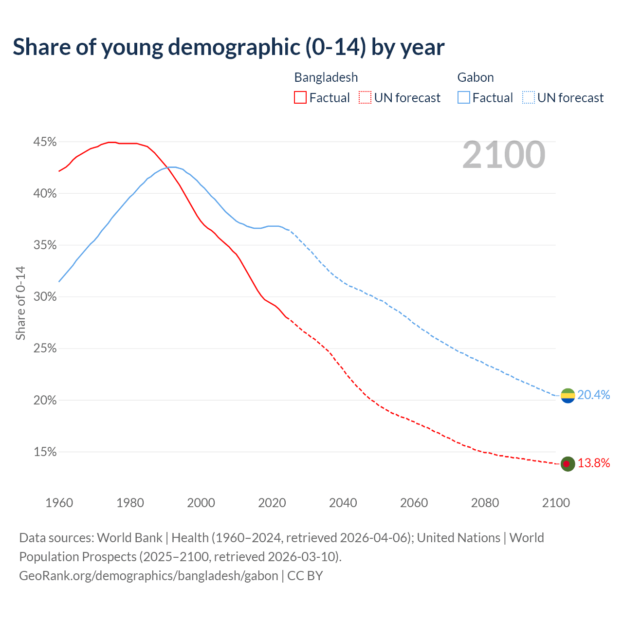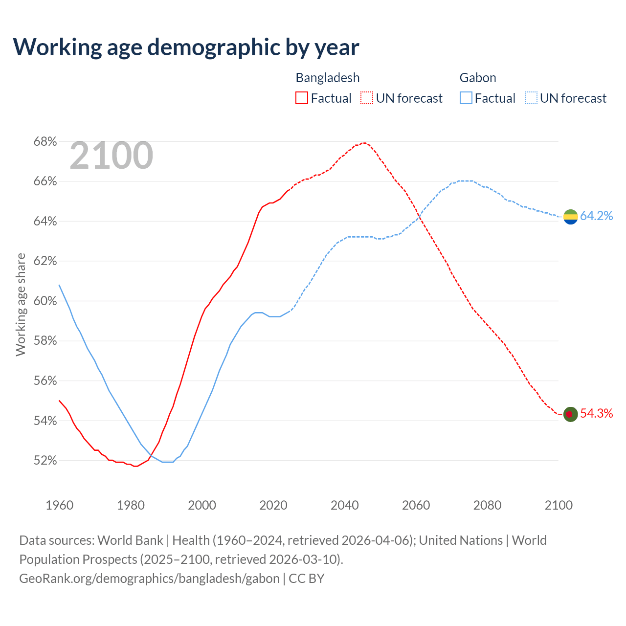 Median age Bangladesh vs Gabon, 1960-2100