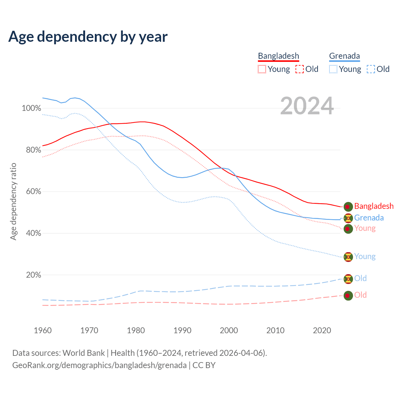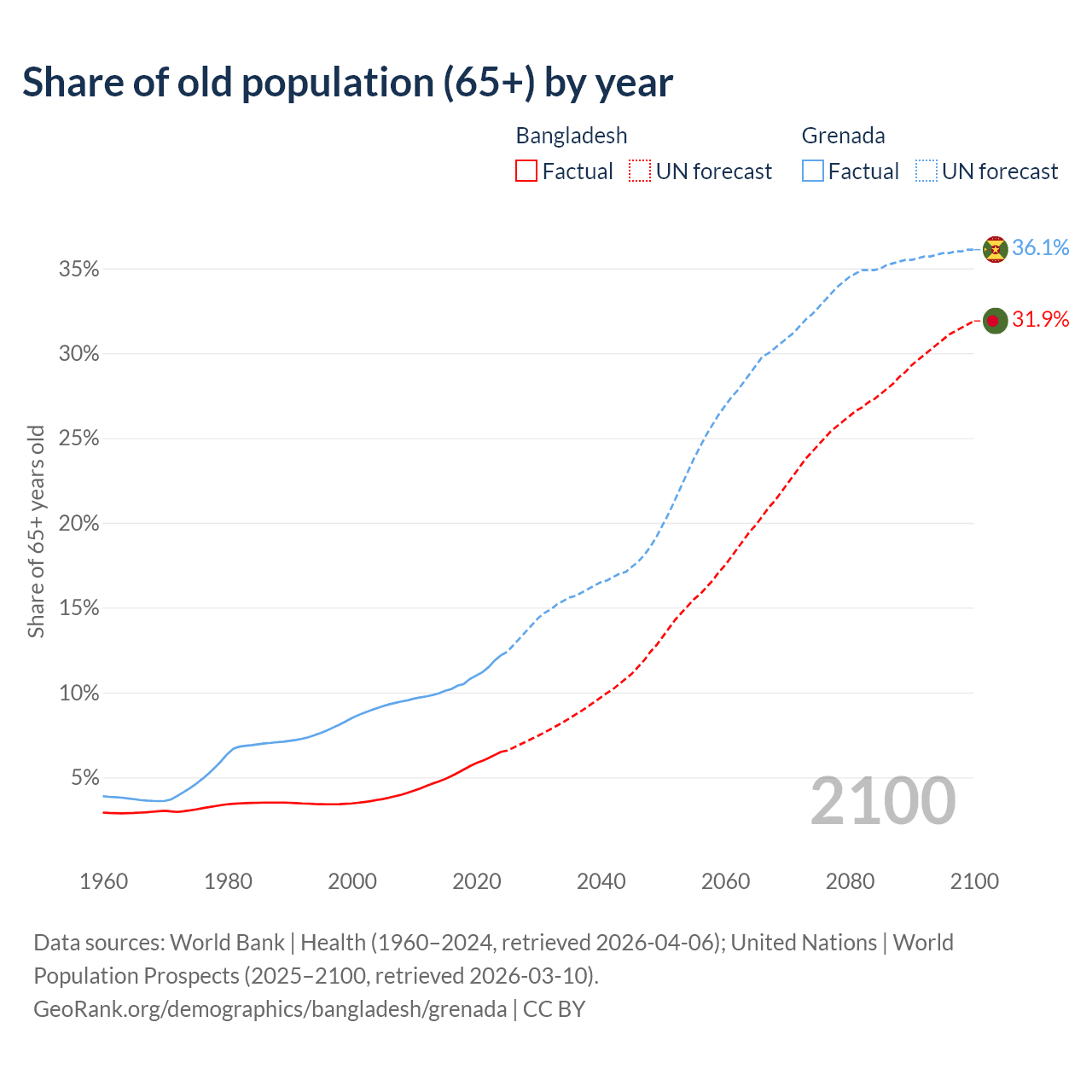 The share of older people aged 65 and over is 6.5% in Bangladesh and 12.2% in Grenada. Life expectancy in Bangladesh compared to Grenada .
