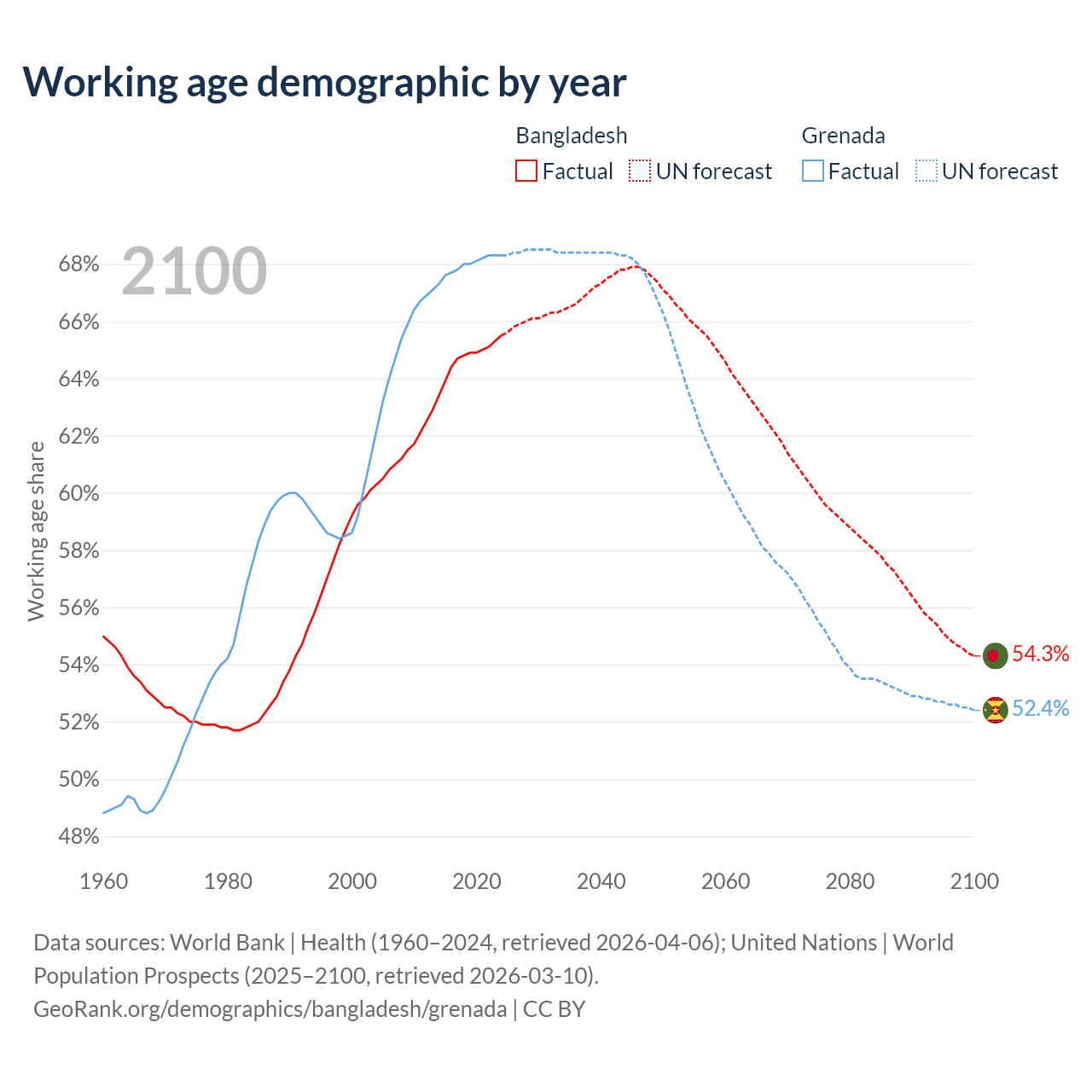 Median age Bangladesh vs Grenada, 1960-2100