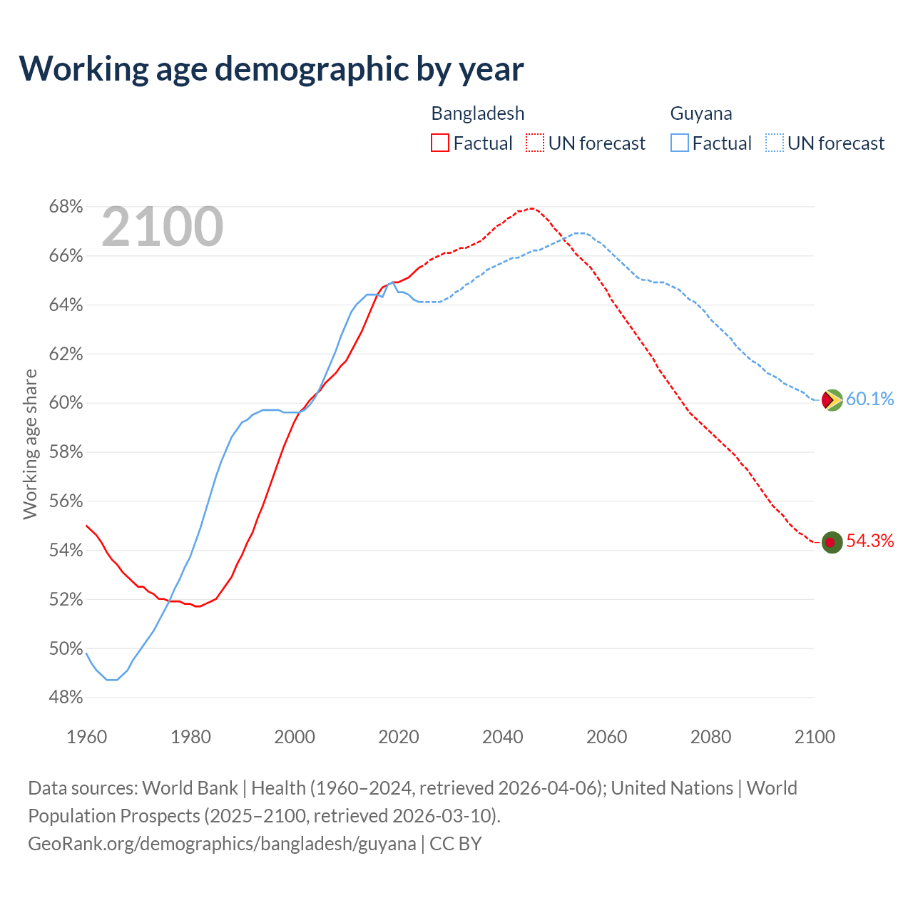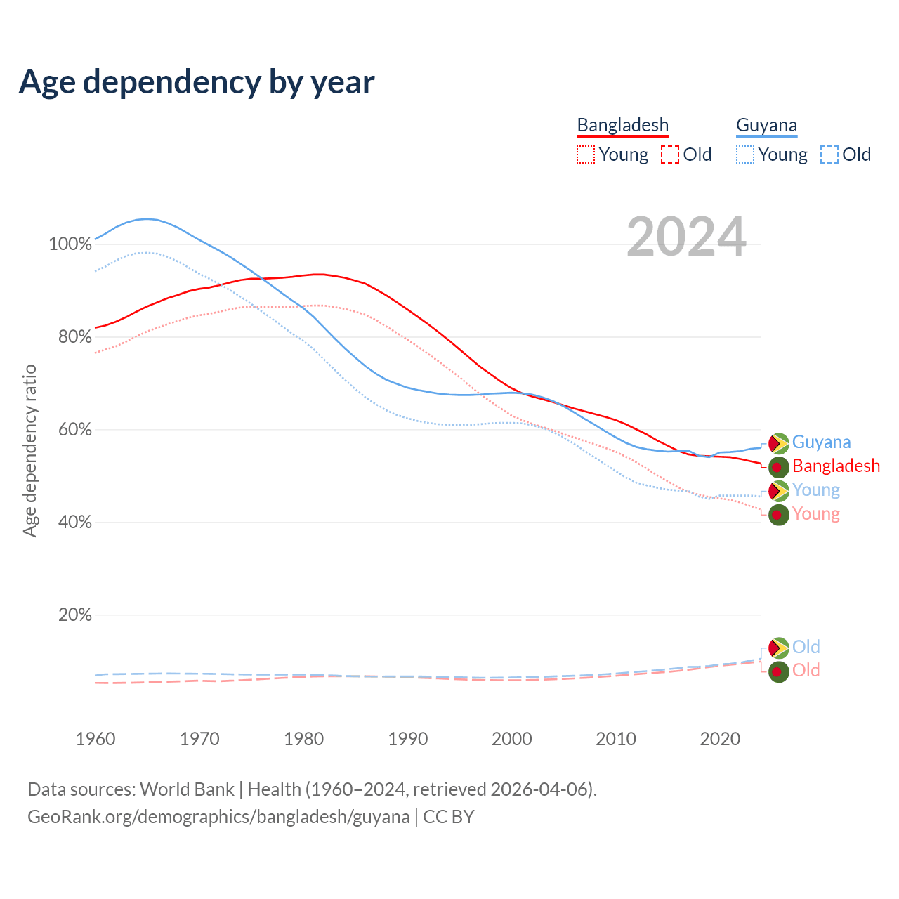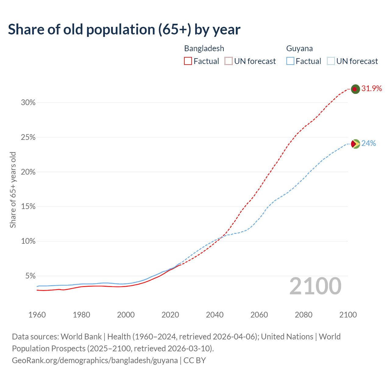 - The share of old-age demographic (65+) in Bangladesh is 6.5% vs 6.73% in Guyana.