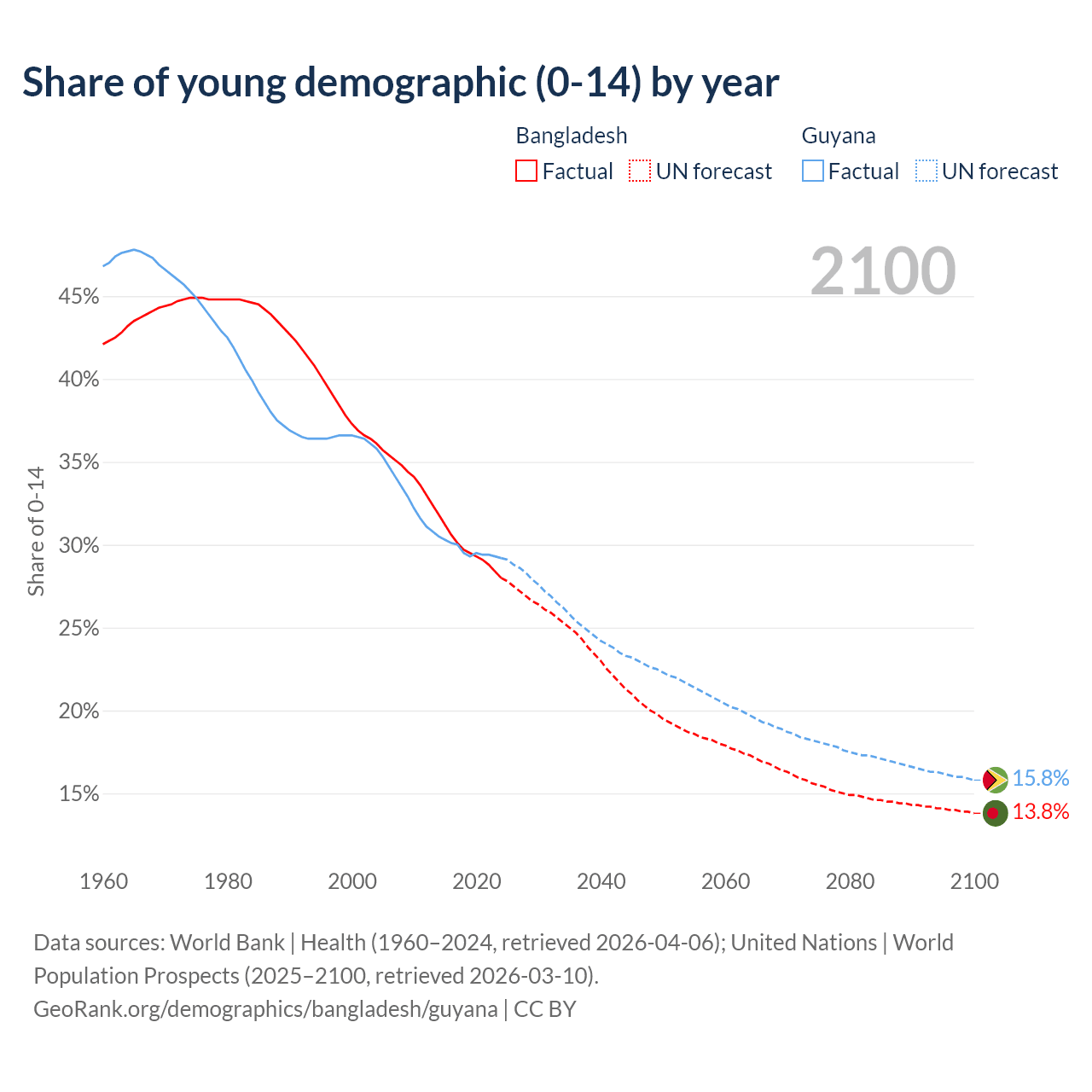 - The share of young demographic (0-15 years old) in Bangladesh is 28% vs 29.2% in Guyana.