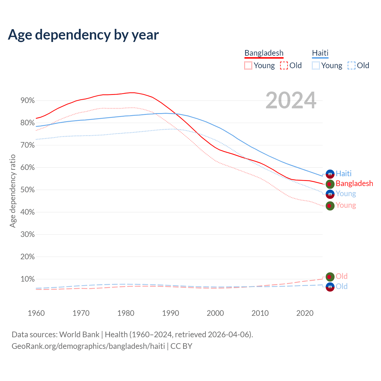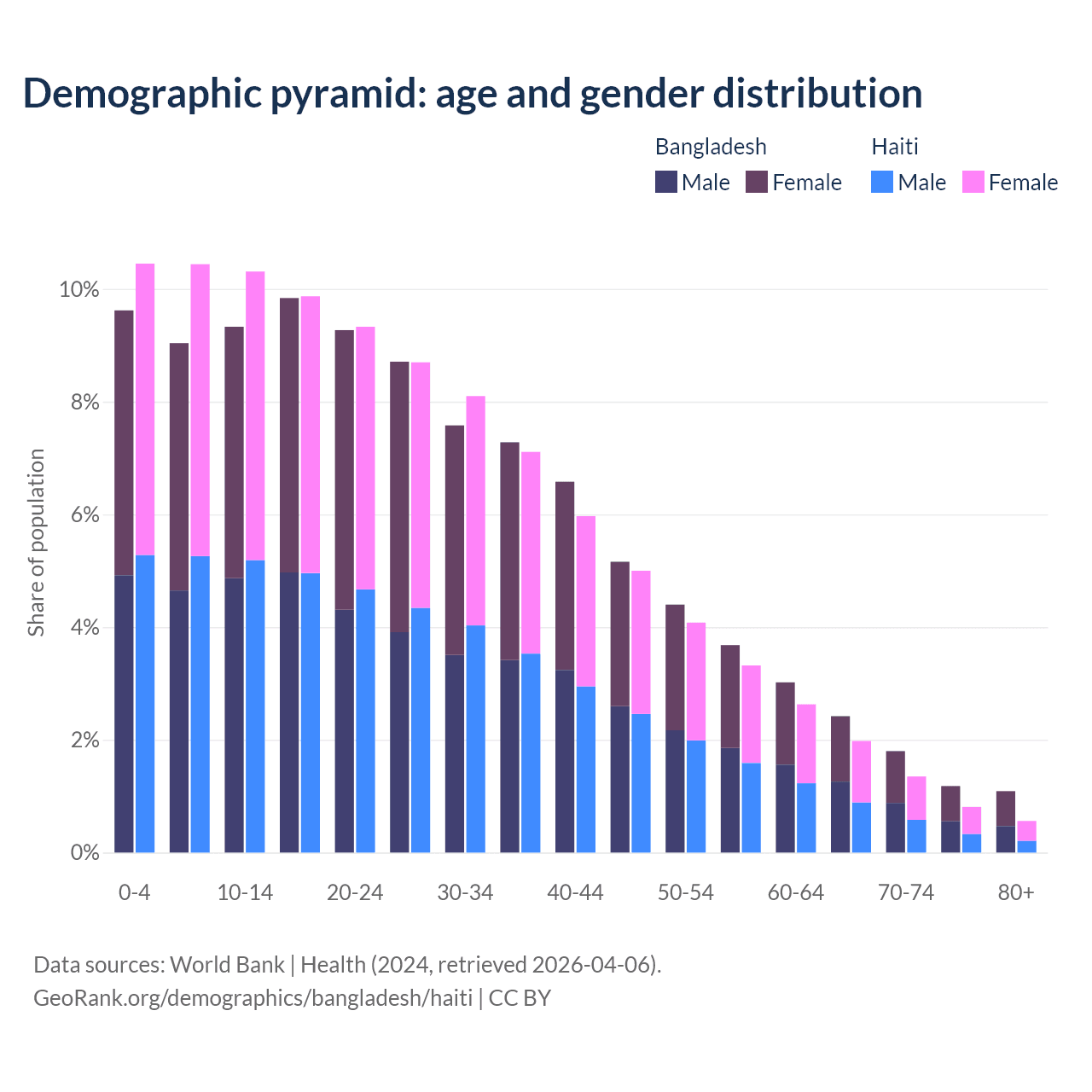 - Bangladesh is ranked 124/196 by median age (oldest to youngest) vs 135/196 for Haiti.