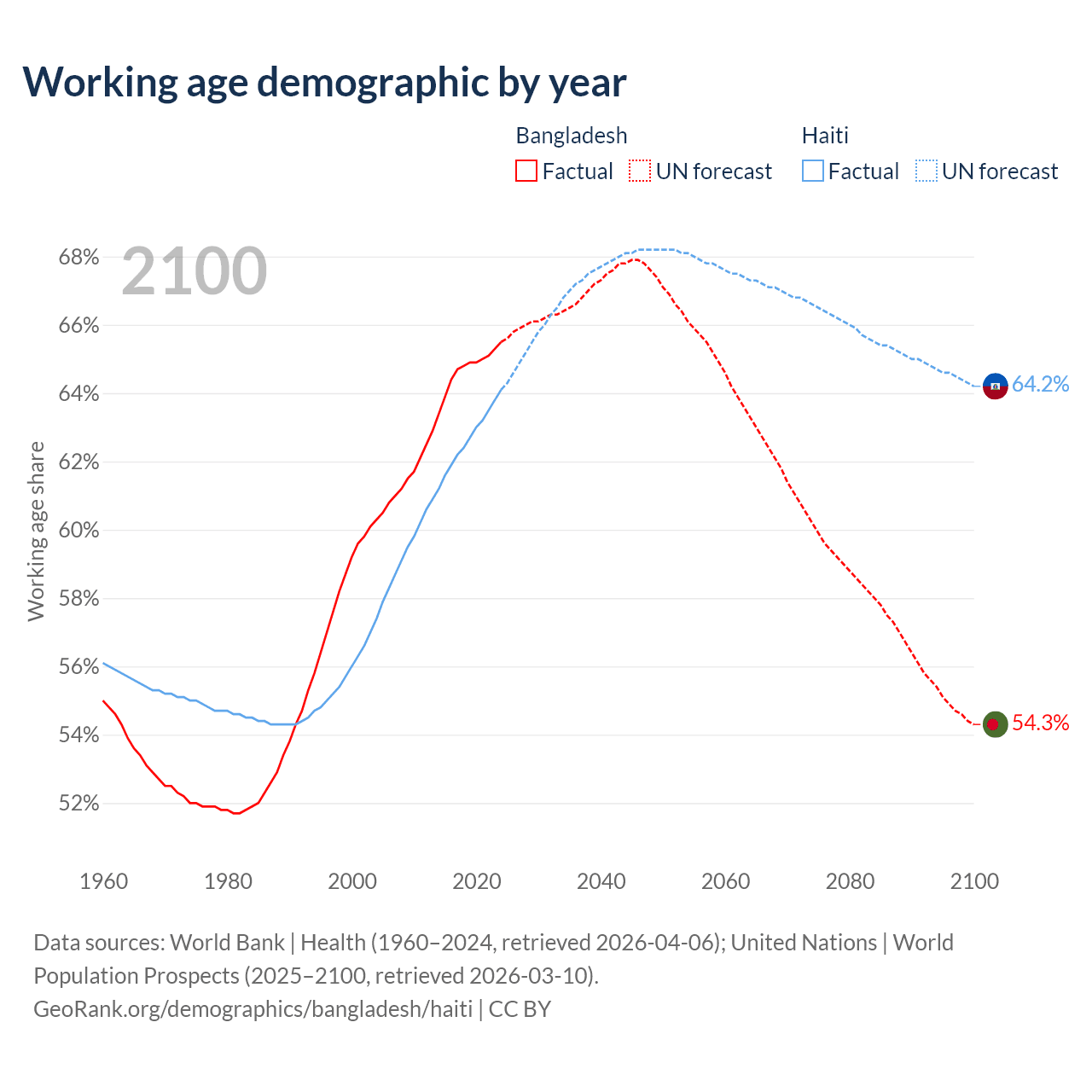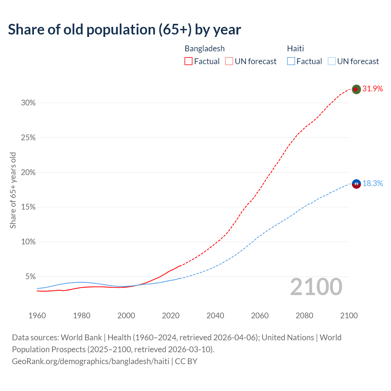 - The share of old-age demographic (65+) in Bangladesh is 6.5% vs 4.71% in Haiti.