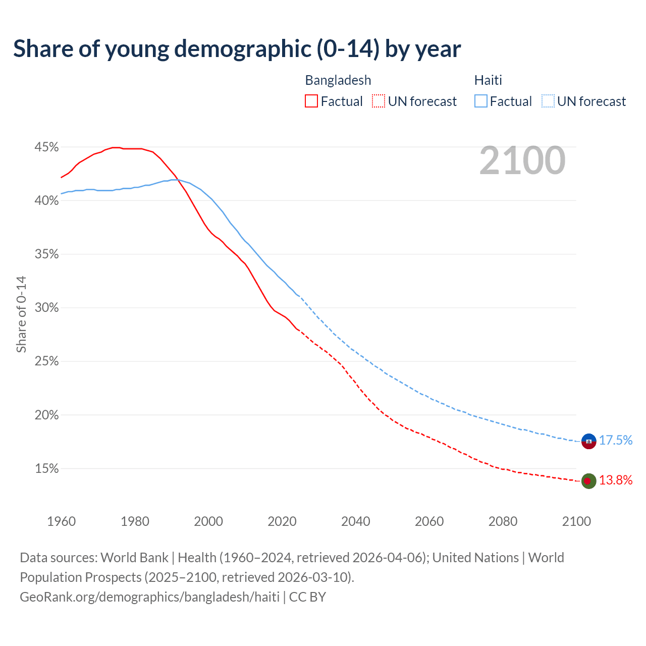 - The share of young demographic (0-15 years old) in Bangladesh is 28% vs 31.2% in Haiti.