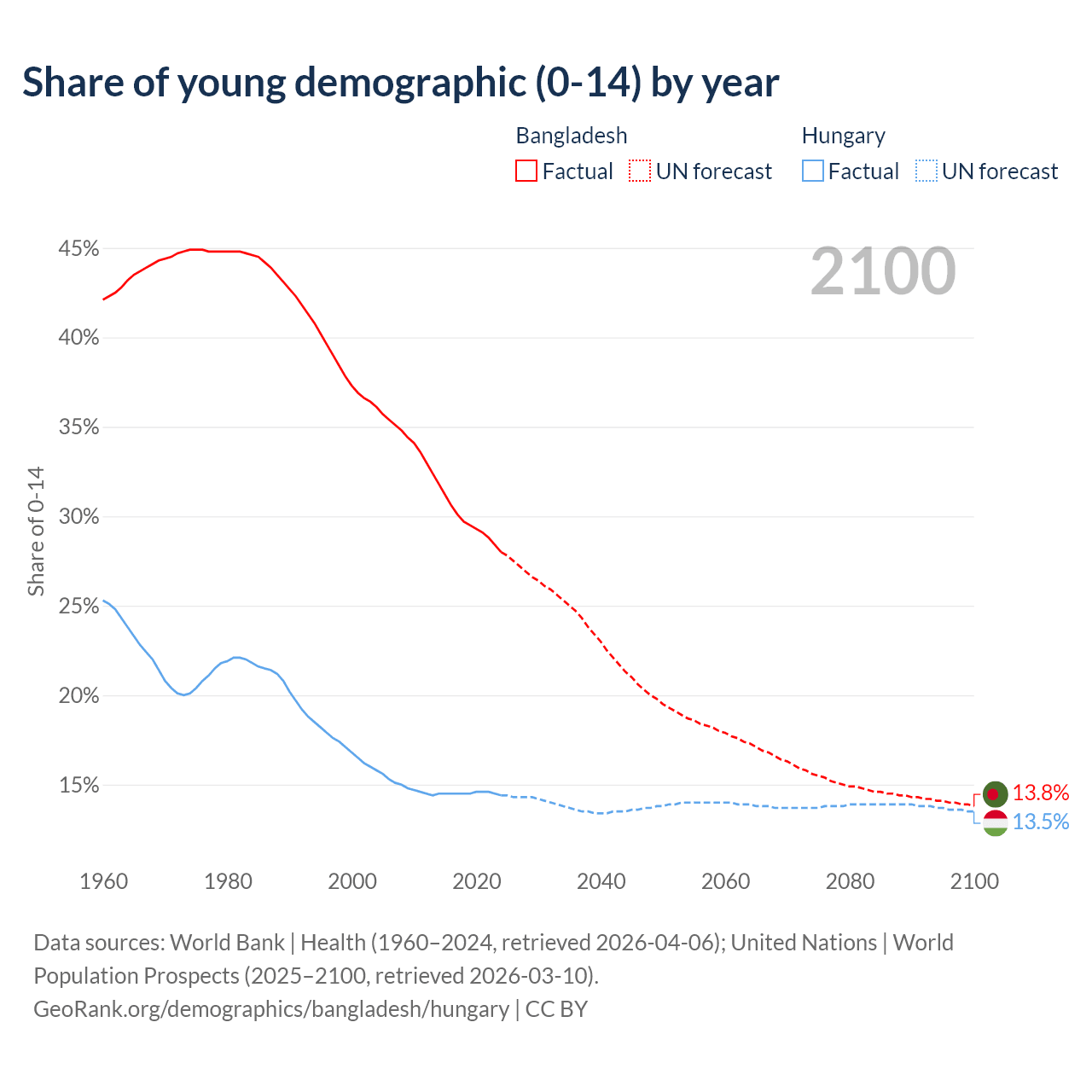 - The share of young demographic (0-15 years old) in Bangladesh is 28% vs 14.4% in Hungary.