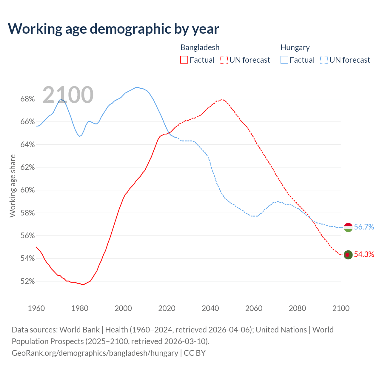 - Bangladesh has 117M working age adults (aged 15-64) vs 6.12M in Hungary.