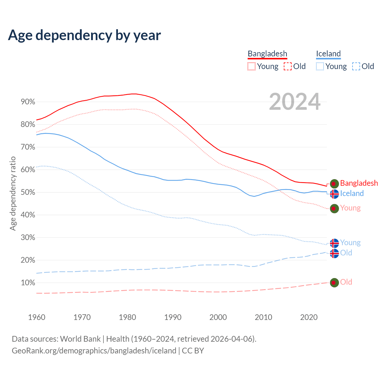 - Bangladesh is ranked 124/196 by median age (oldest to youngest) vs 65/196 for Iceland.