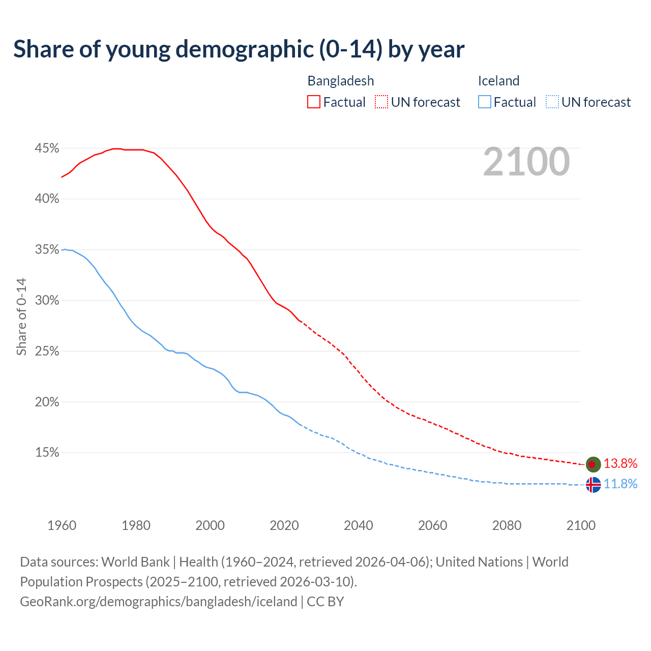 - The share of young demographic (0-15 years old) in Bangladesh is 28% vs 17.8% in Iceland.
