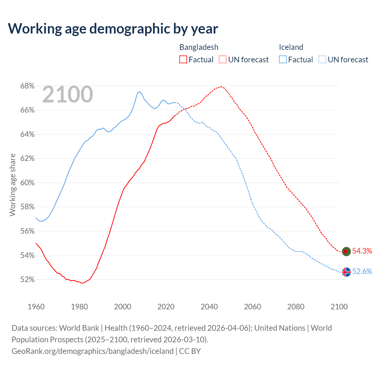 Median age Bangladesh vs Iceland, 1960-2100