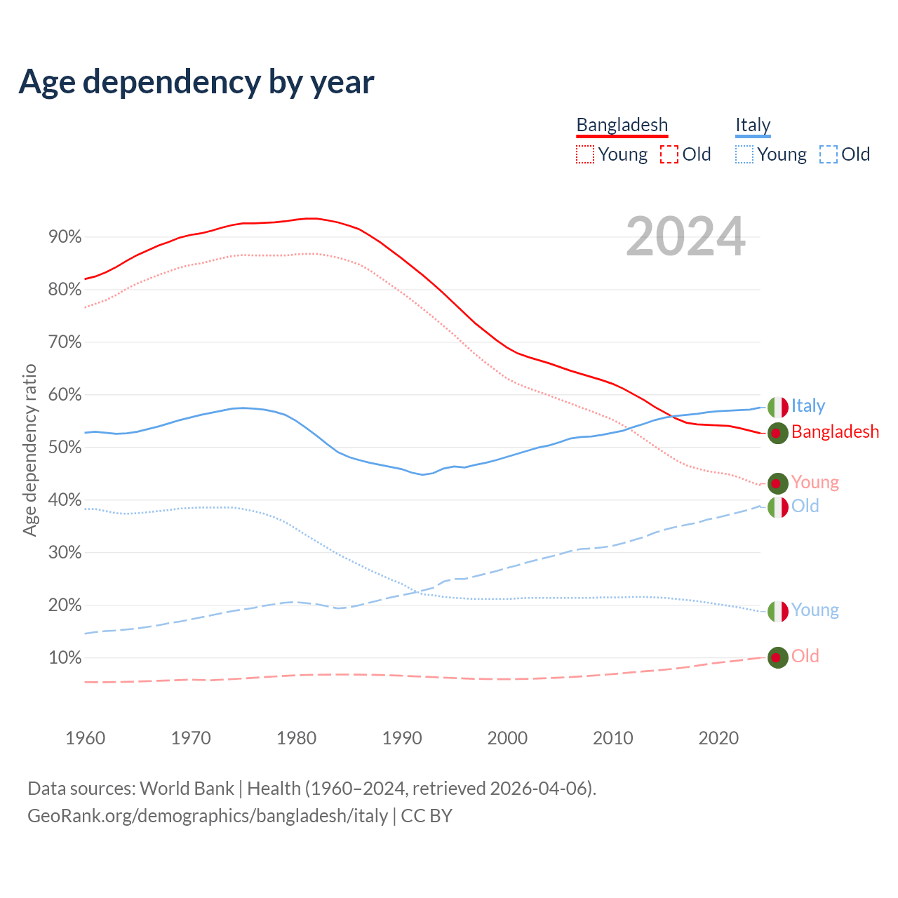 The share of older people aged 65 and over is 6.5% in Bangladesh and 24.6% in Italy. Life expectancy in Bangladesh compared to Italy .