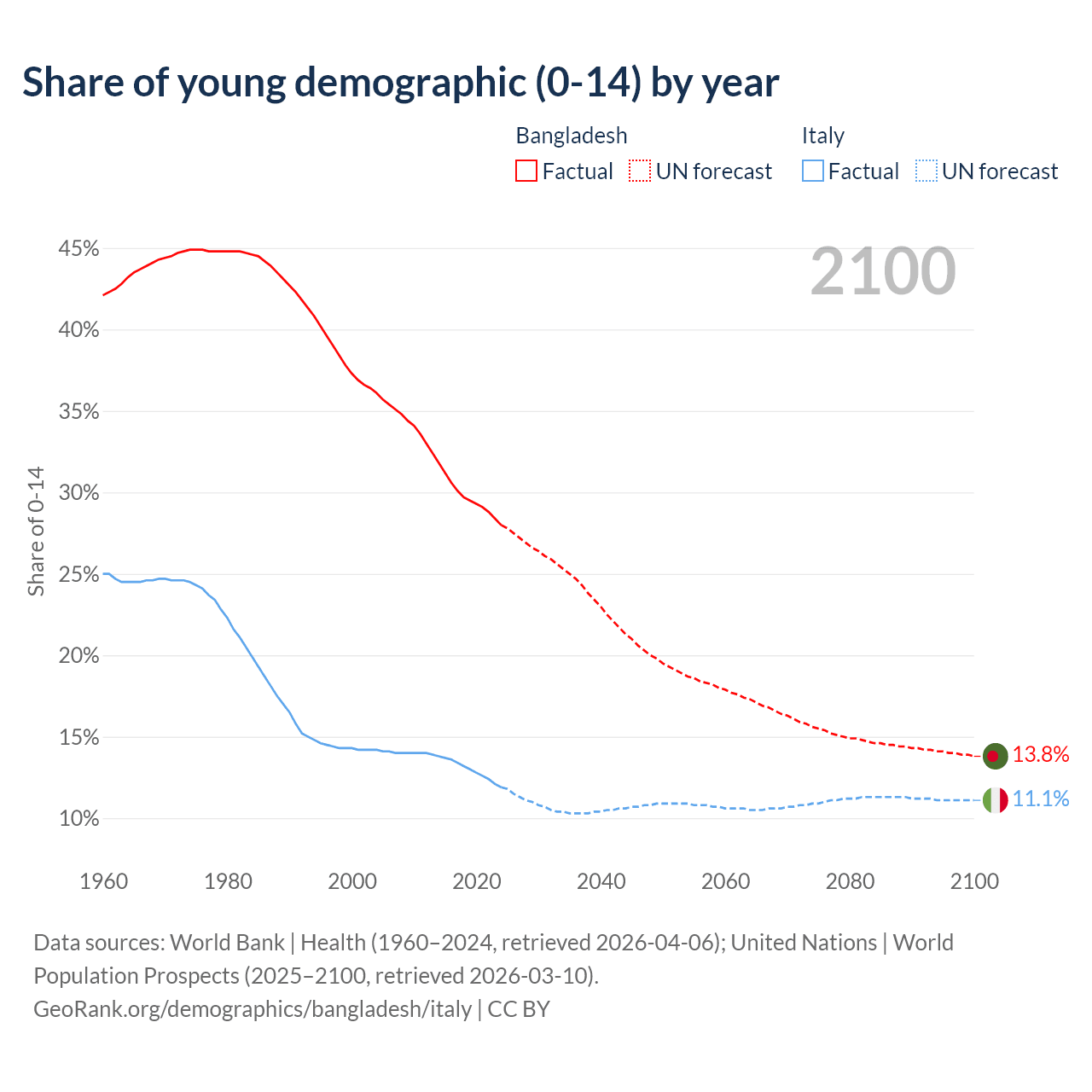 - The share of young demographic (0-15 years old) in Bangladesh is 28% vs 11.9% in Italy.