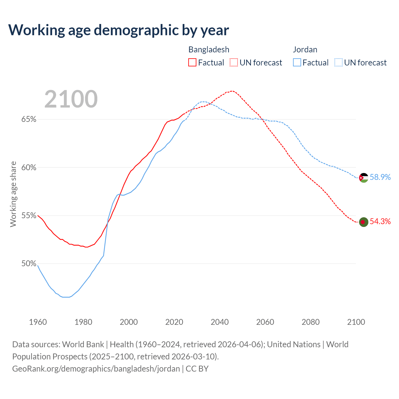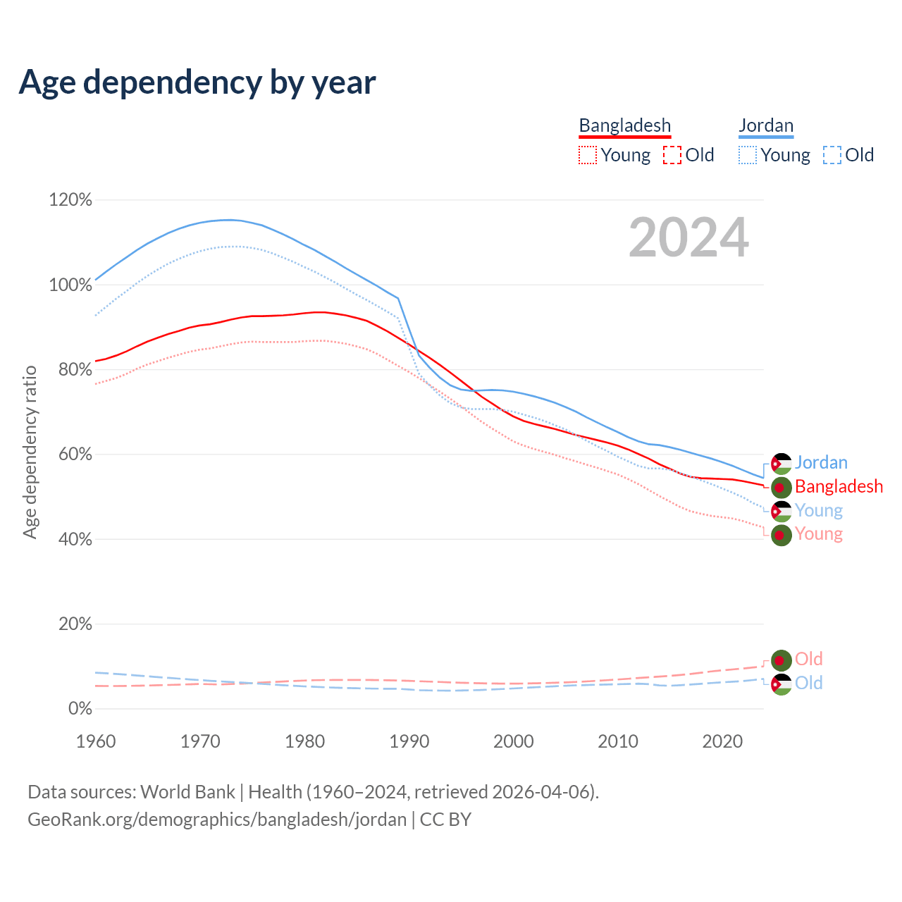 - Bangladesh is ranked 124/196 by median age (oldest to youngest) vs 131/196 for Jordan.