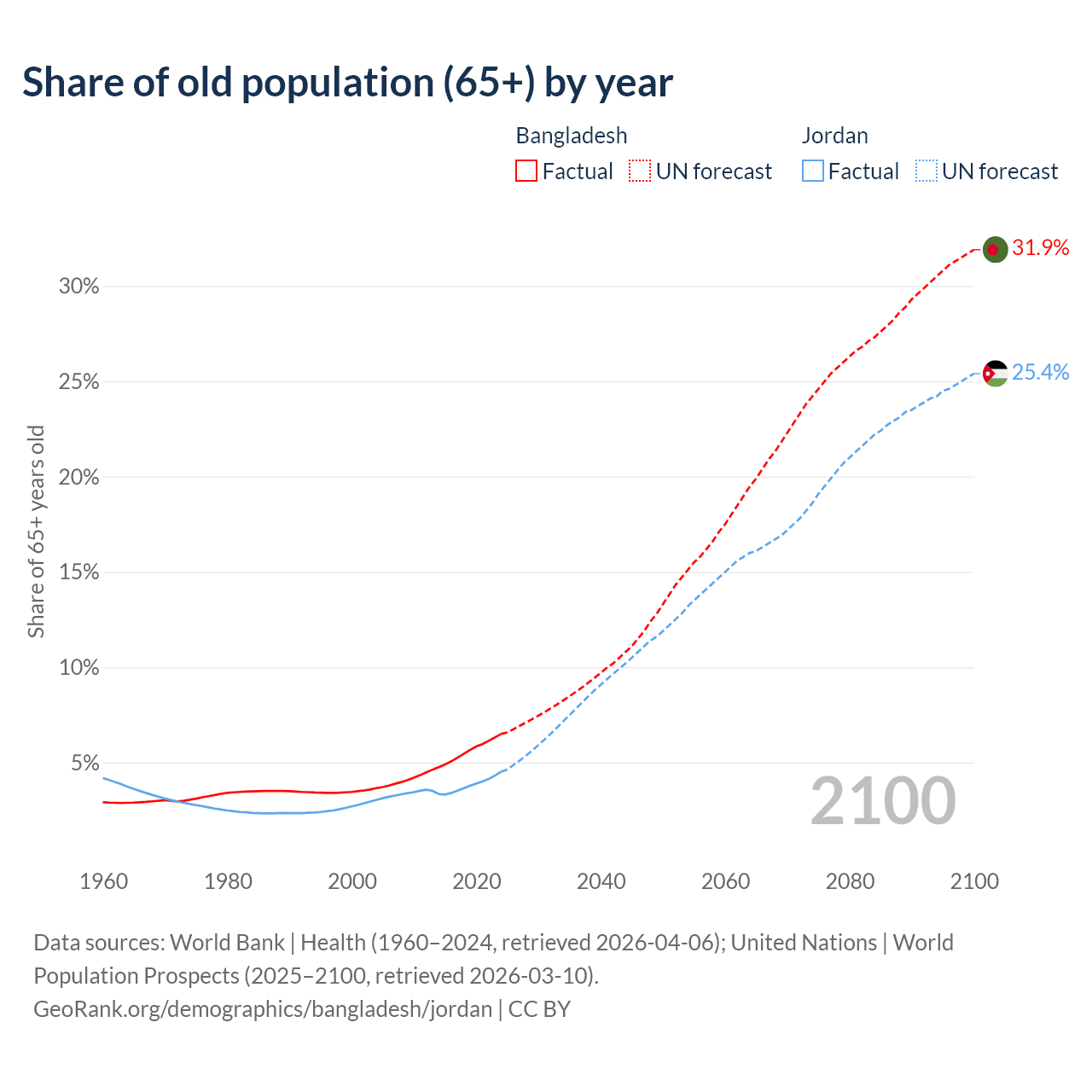 The share of older people aged 65 and over is 6.5% in Bangladesh and 4.52% in Jordan. Life expectancy in Bangladesh compared to Jordan .
