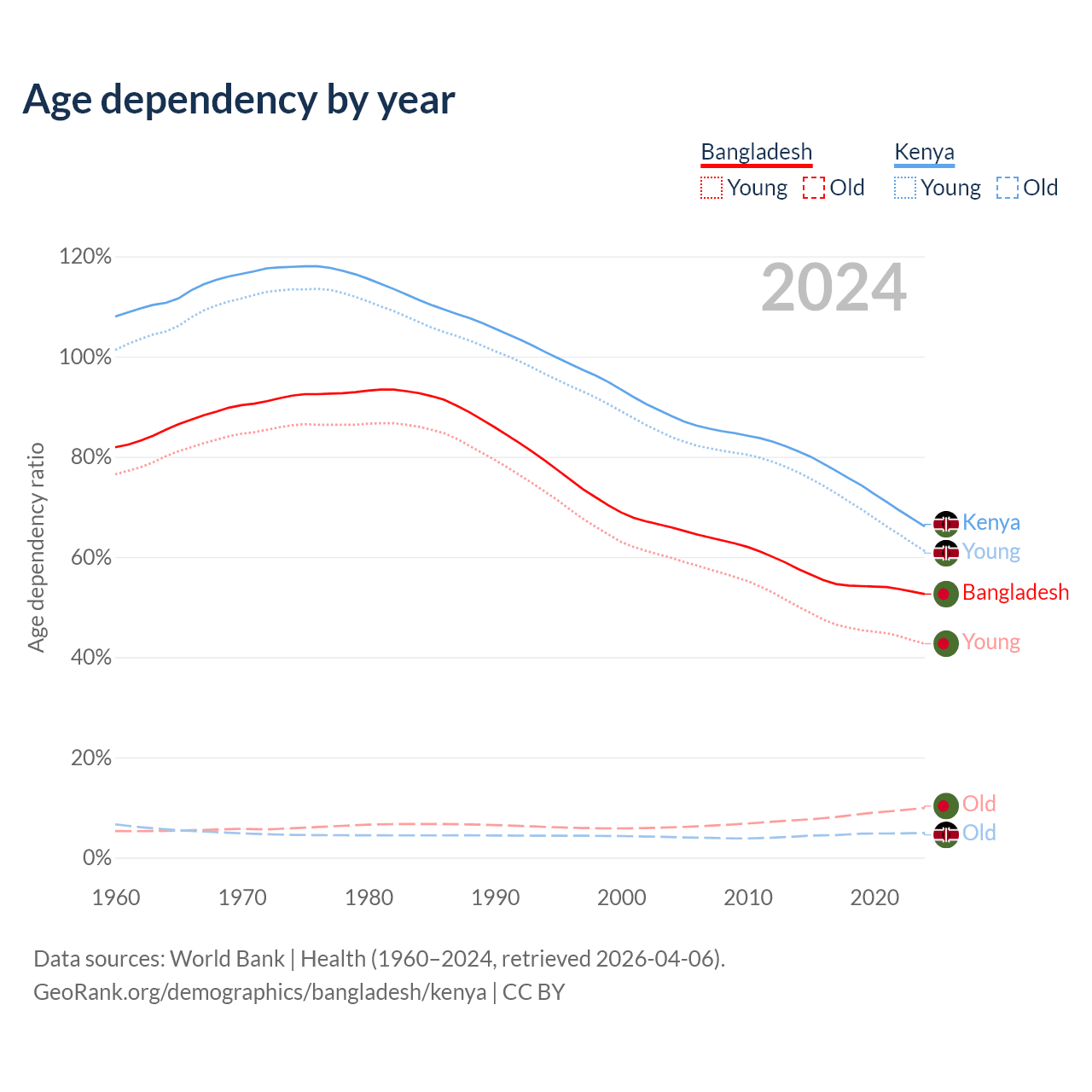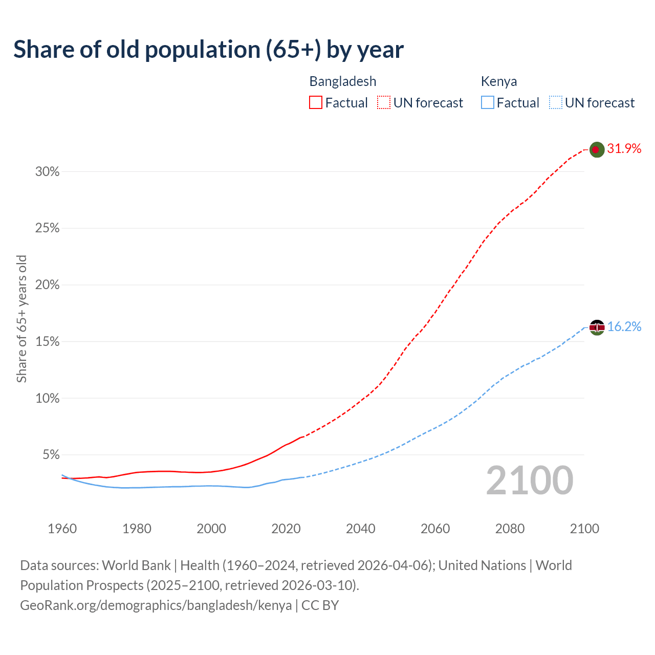 The share of older people aged 65 and over is 6.5% in Bangladesh and 2.97% in Kenya. Life expectancy in Bangladesh compared to Kenya .