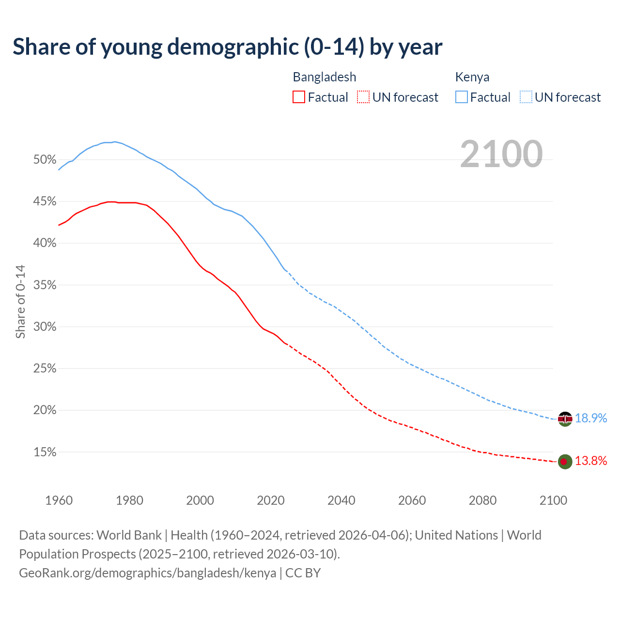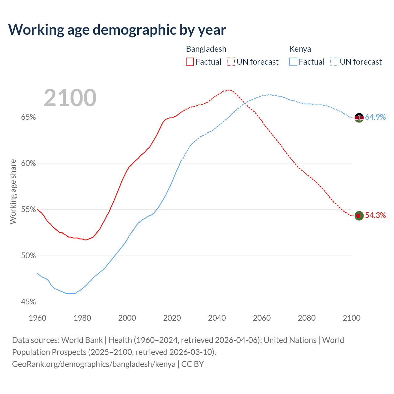 Median age Bangladesh vs Kenya, 1960-2100