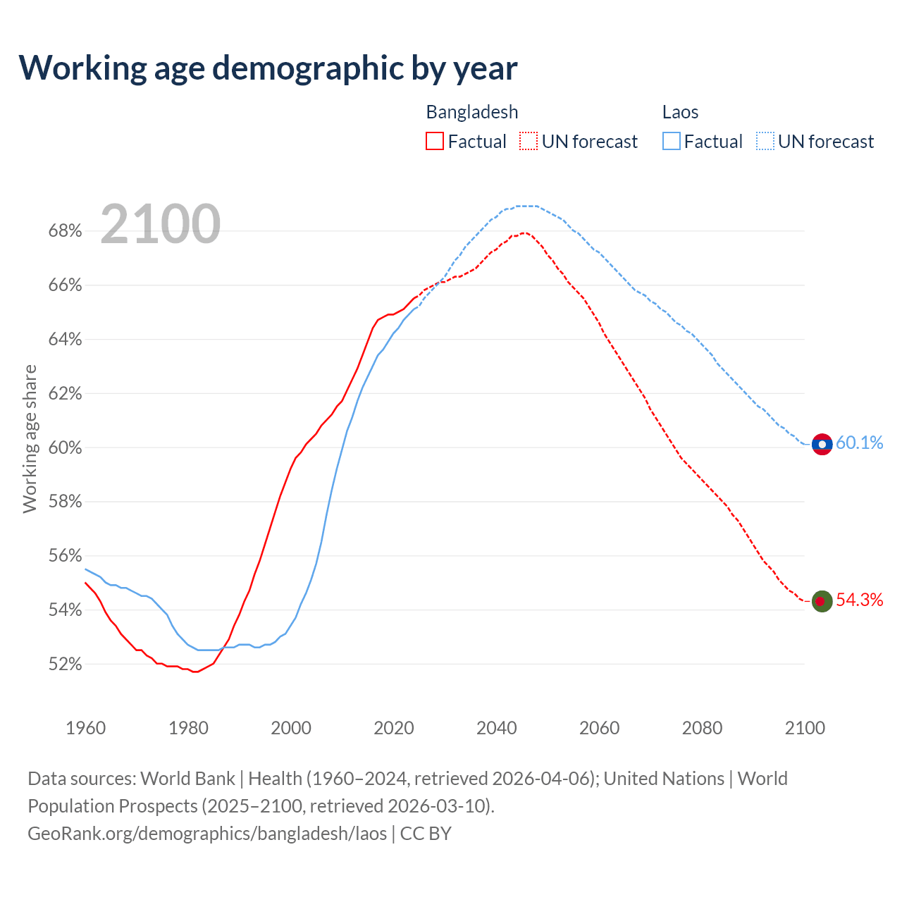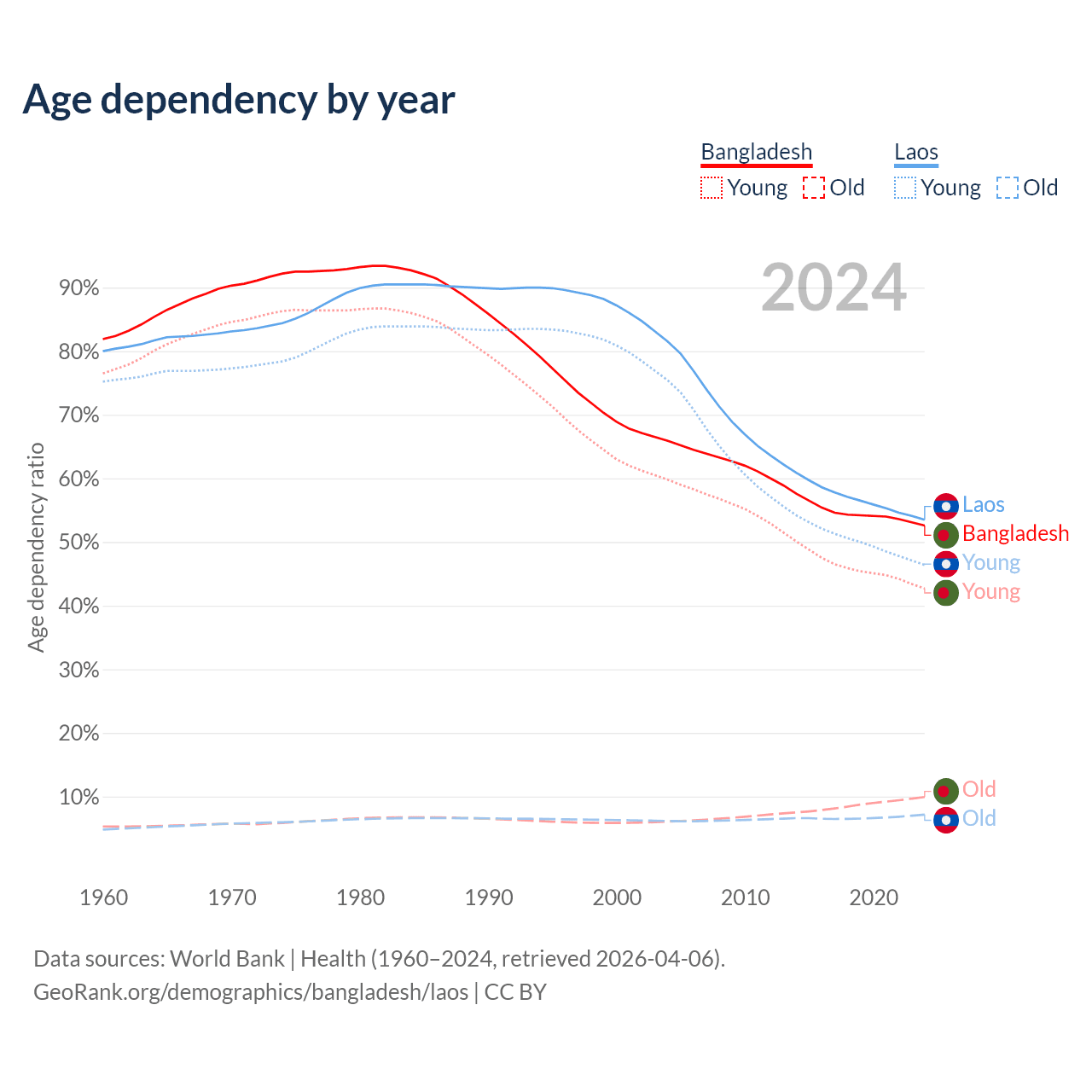 - Bangladesh is ranked 124/196 by median age (oldest to youngest) vs 130/196 for Laos.