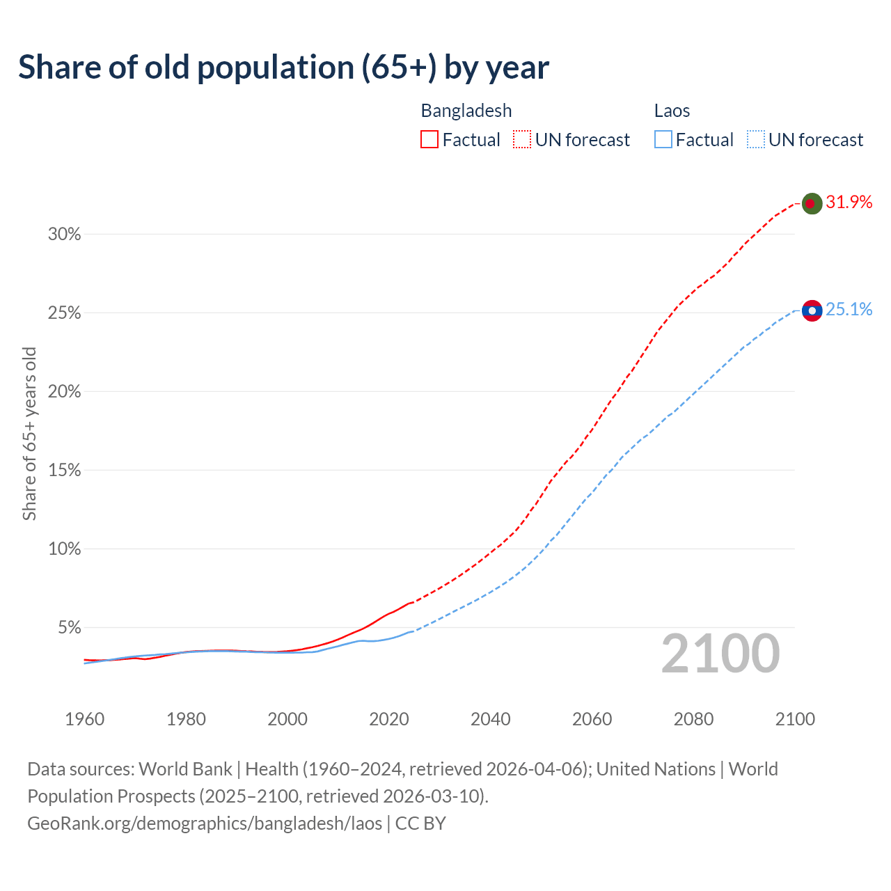 The share of older people aged 65 and over is 6.5% in Bangladesh and 4.67% in Laos. Life expectancy in Bangladesh compared to Laos .